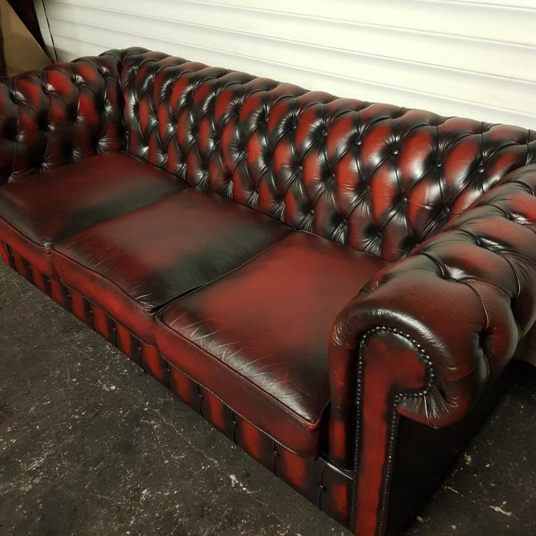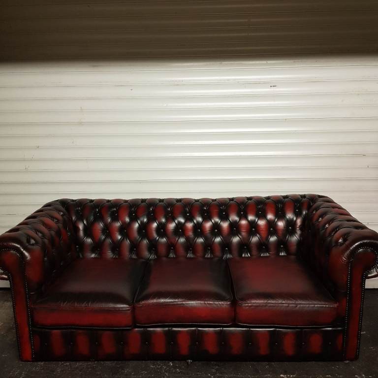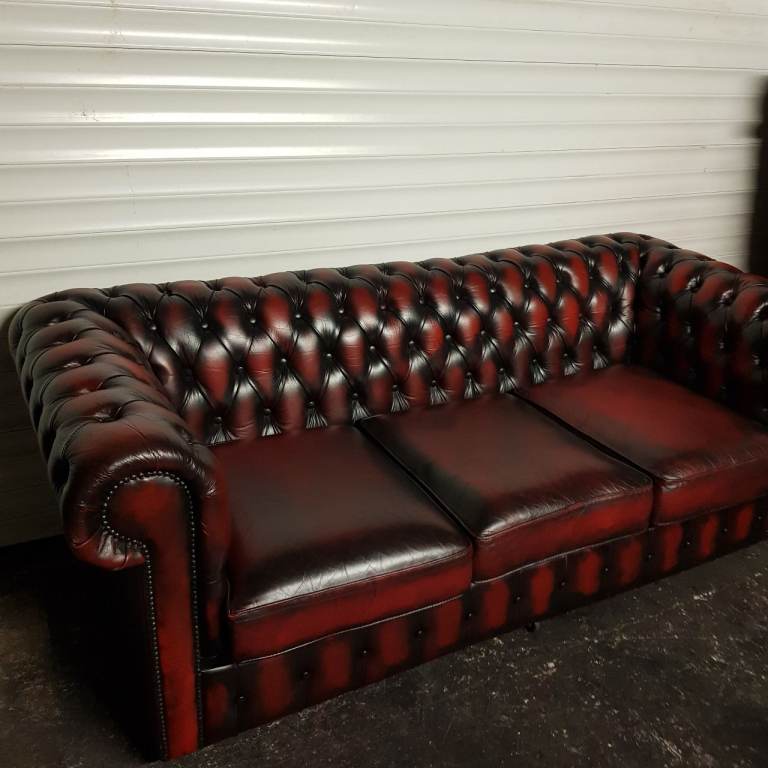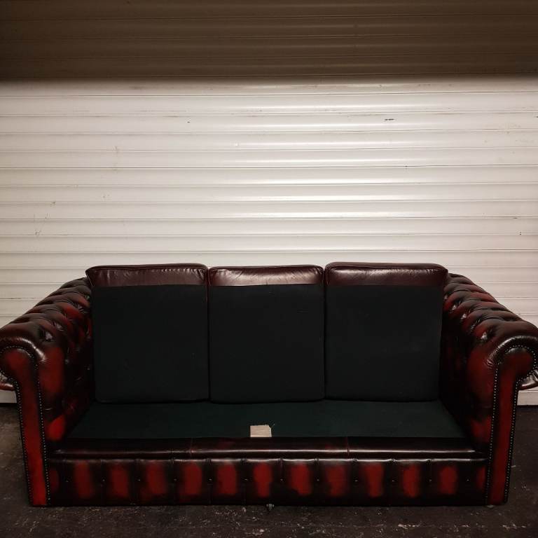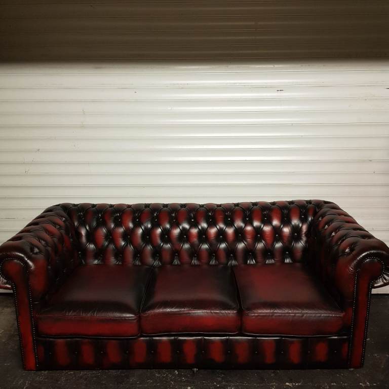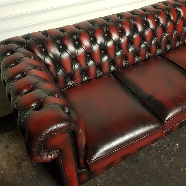 This is a stunning matching set. Both sofa and armchair are beautiful examples of classic leather Chesterfield pieces. The frames are very well made and solid. The leather is in healthy condition with no tears, stains or holes. The colourway is a beautiful traditional dark oxblood. These pieces have been very well cared for and are simply beautiful.