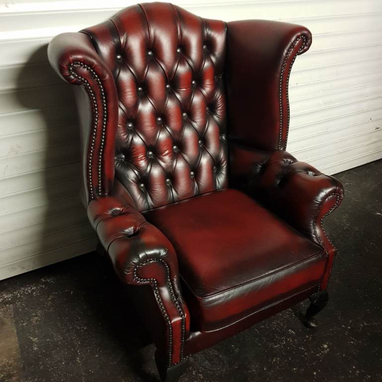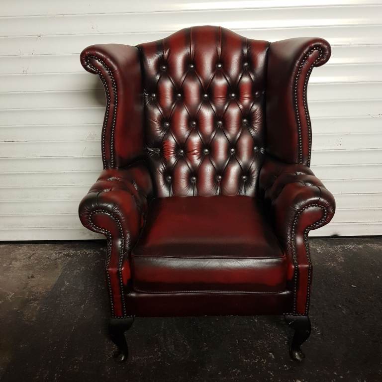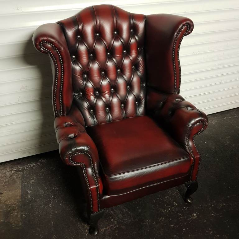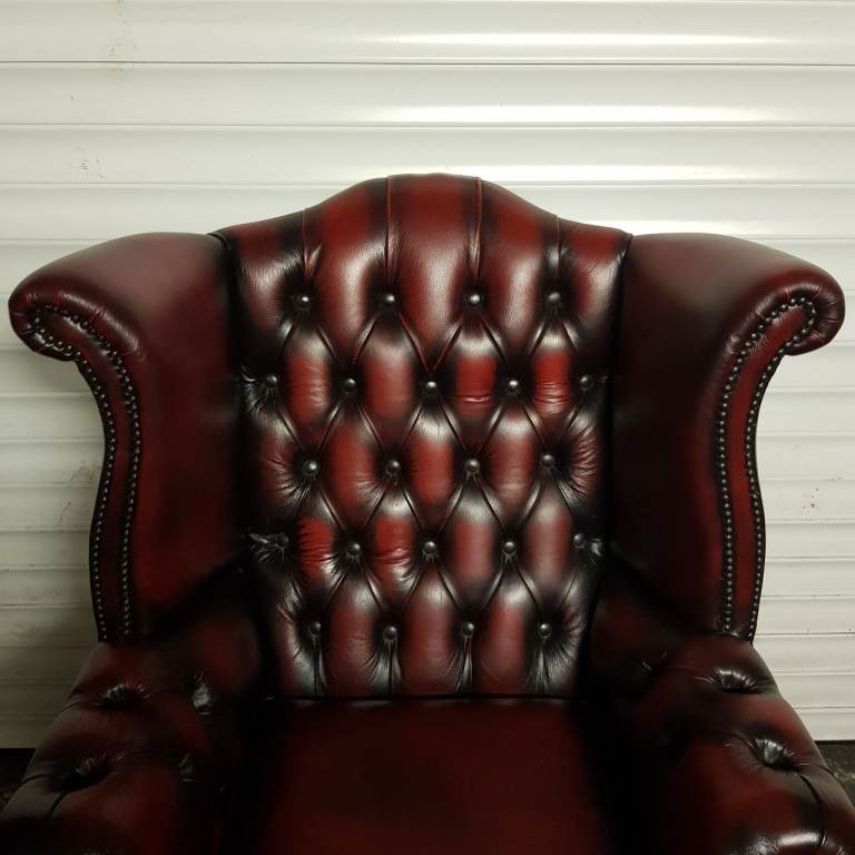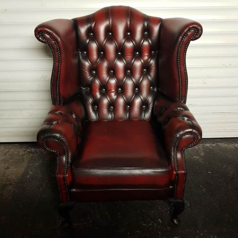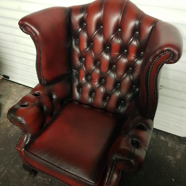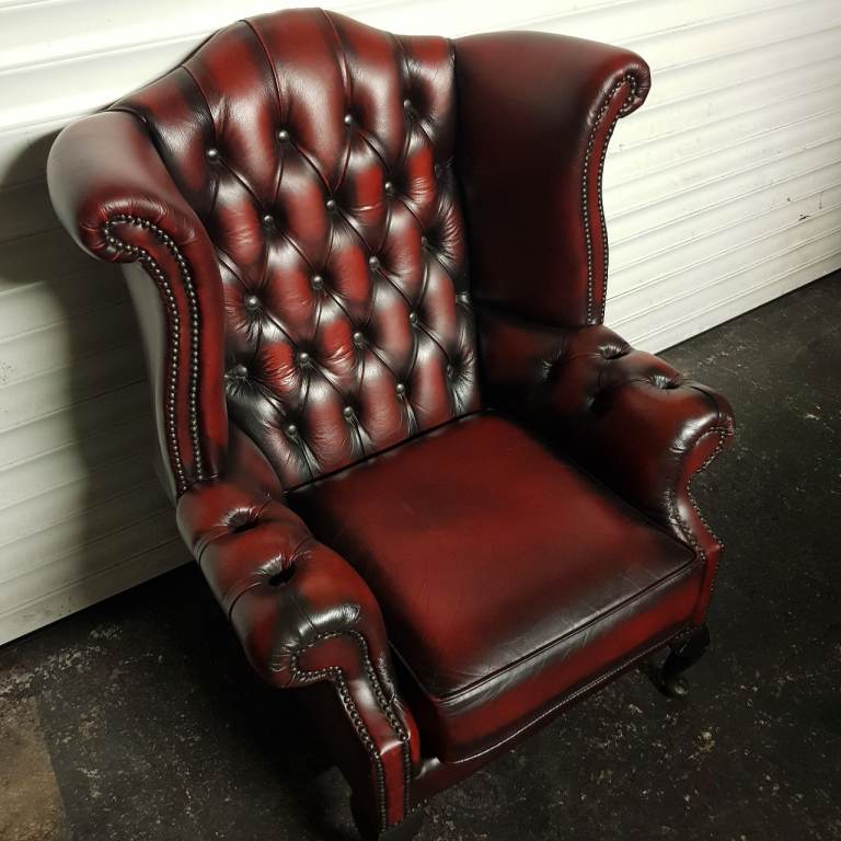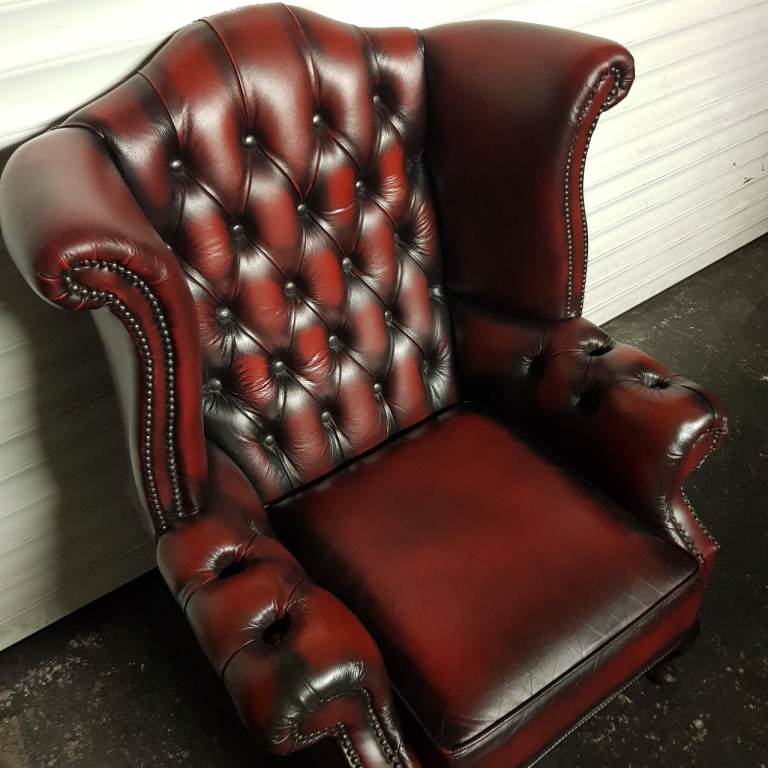 MATCHING Oxblood Leather Chesterfield 3 Seater Sofa +Winged Armchair QUEEN ANNE