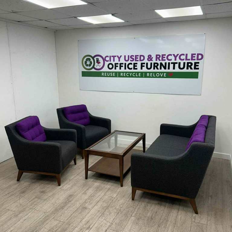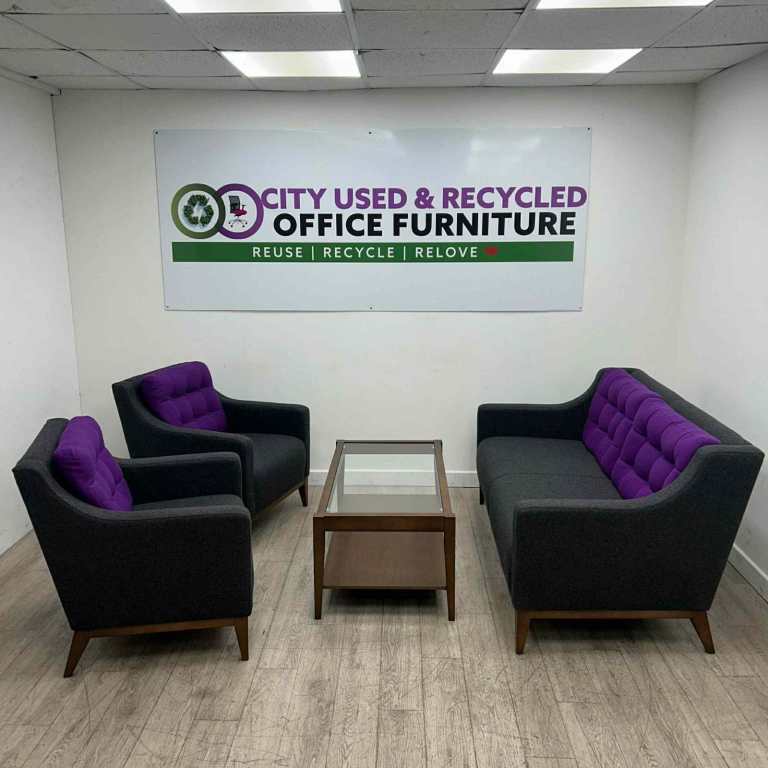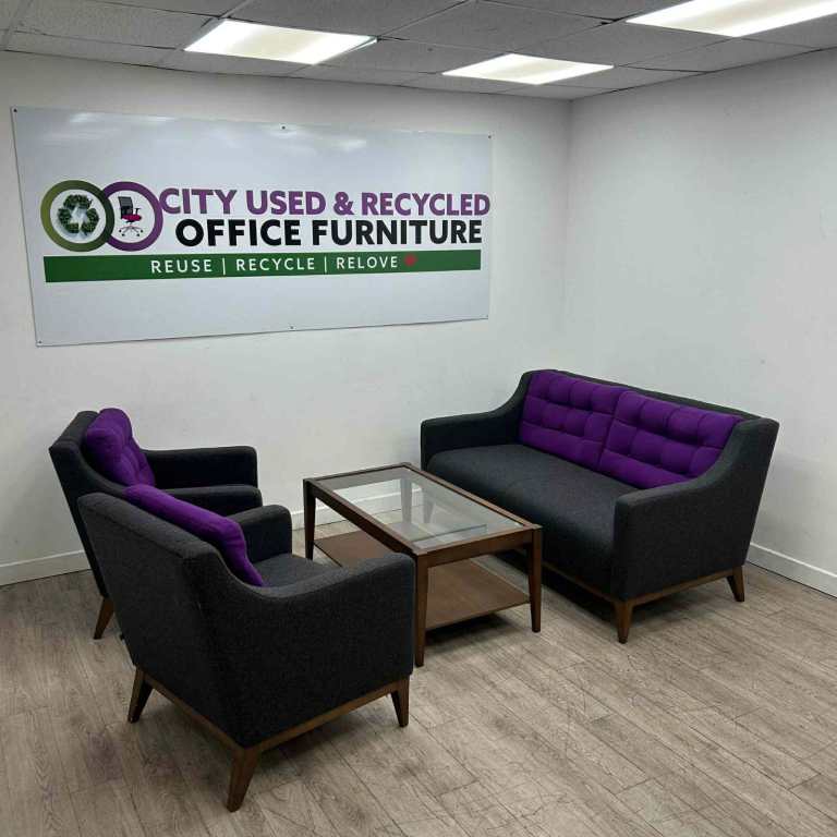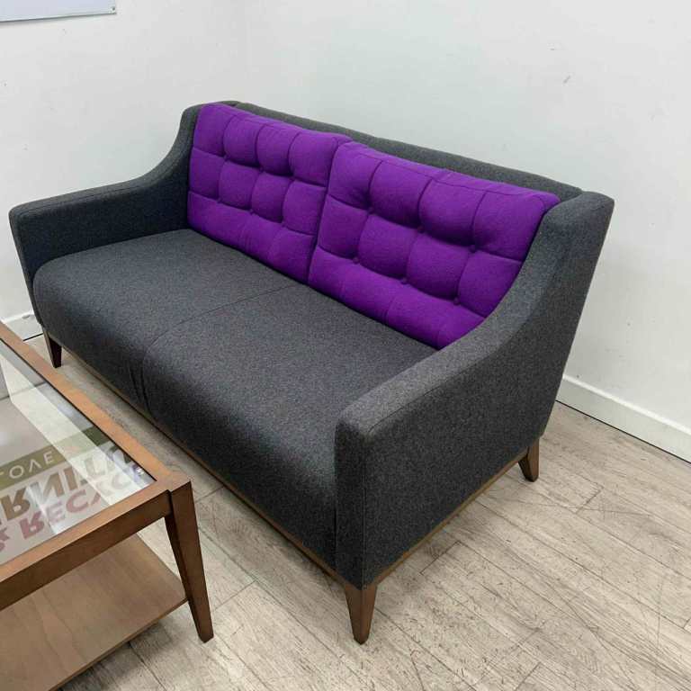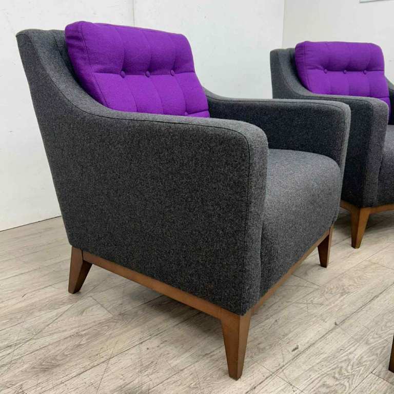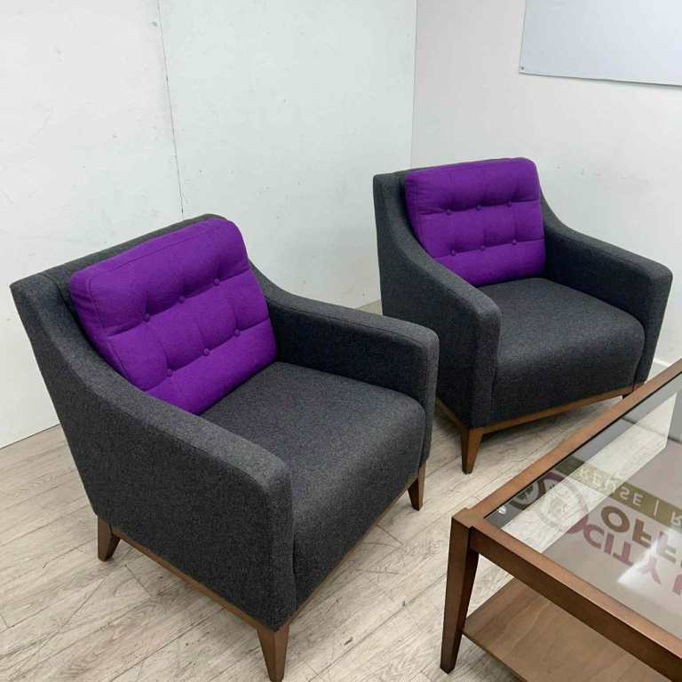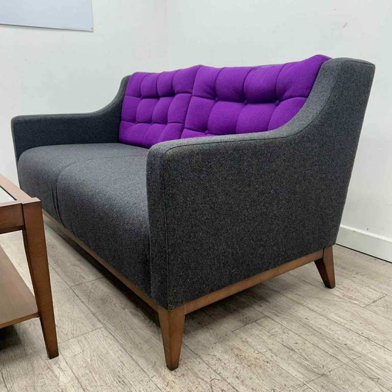 Morgan Hampton Lounge Suite – 2-Seater Sofa, 2 x Armchairs, Grey / Purple w/ Coffee Table, Glass / Walnut