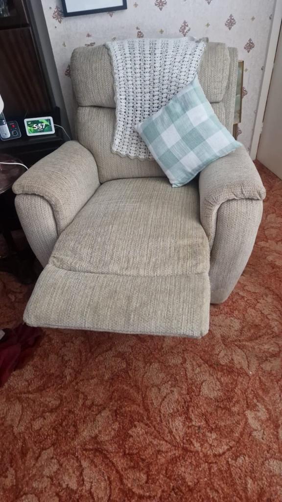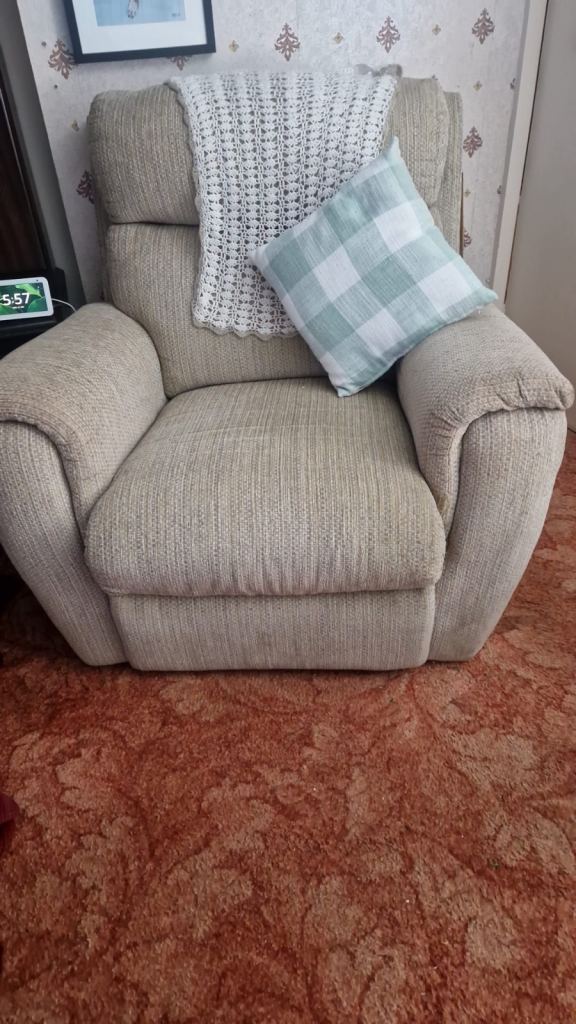 8 yr old 3 piece suite. 1 Recliner chair approx 3ft x 3ft and 1 recliner 3 seater sofa approx 3ft x 8ft + 1standard chair. Good condition. 1 owner only. Very comfortable. Available anytime for collection. Collection only. May have to be disassembled by buyer to move from address.