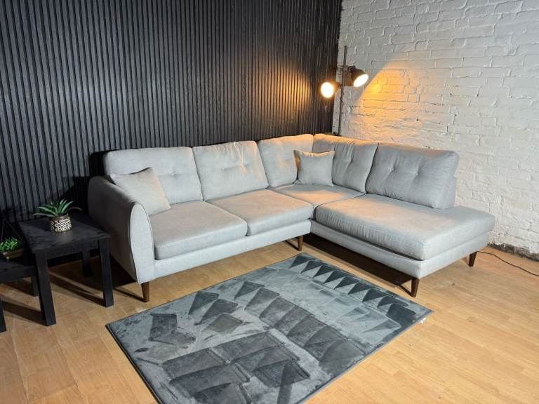 Amazing condition DFS Zinc corner sofa, finished in a modern light grey fabric that suits any contemporary living space.