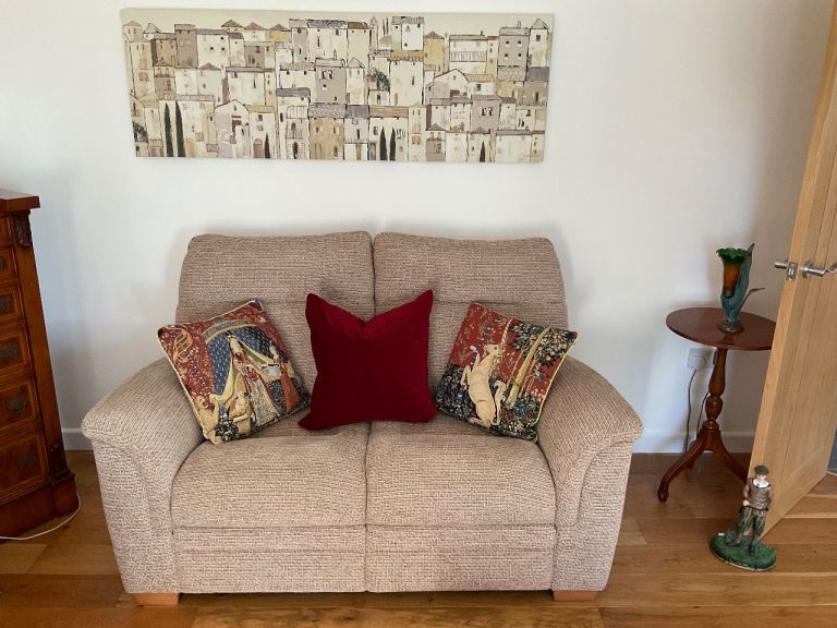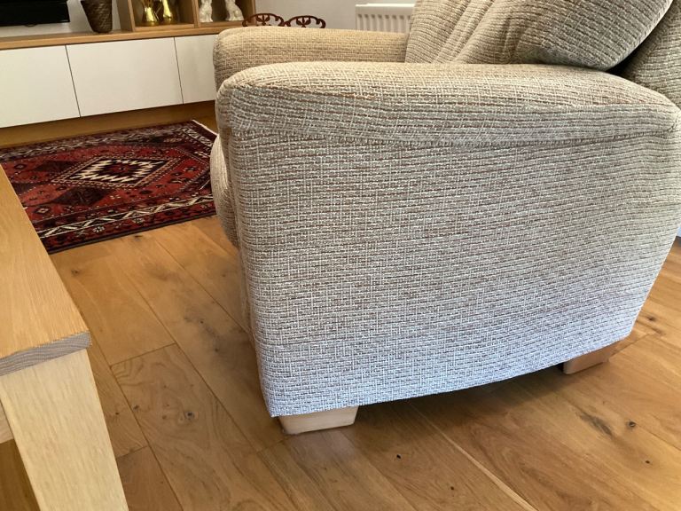 2 seater sofa and 2 chairs, excellent condition, very comfortable quality soft furniture in hard wearing neutral colour.