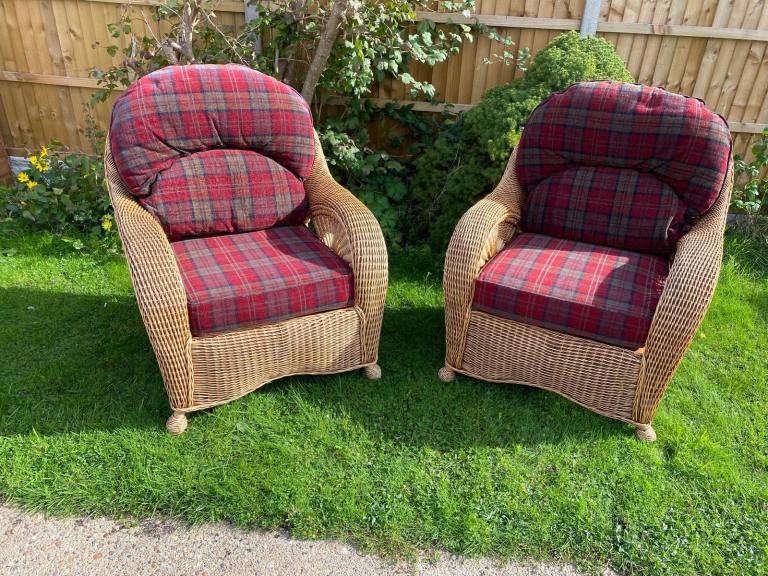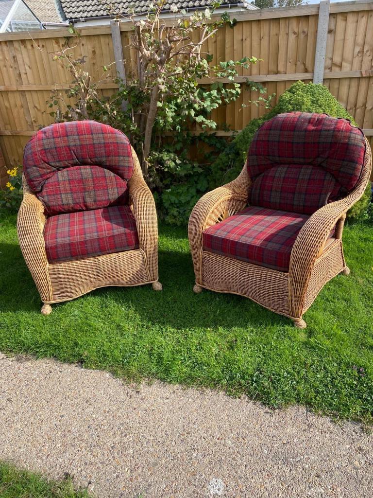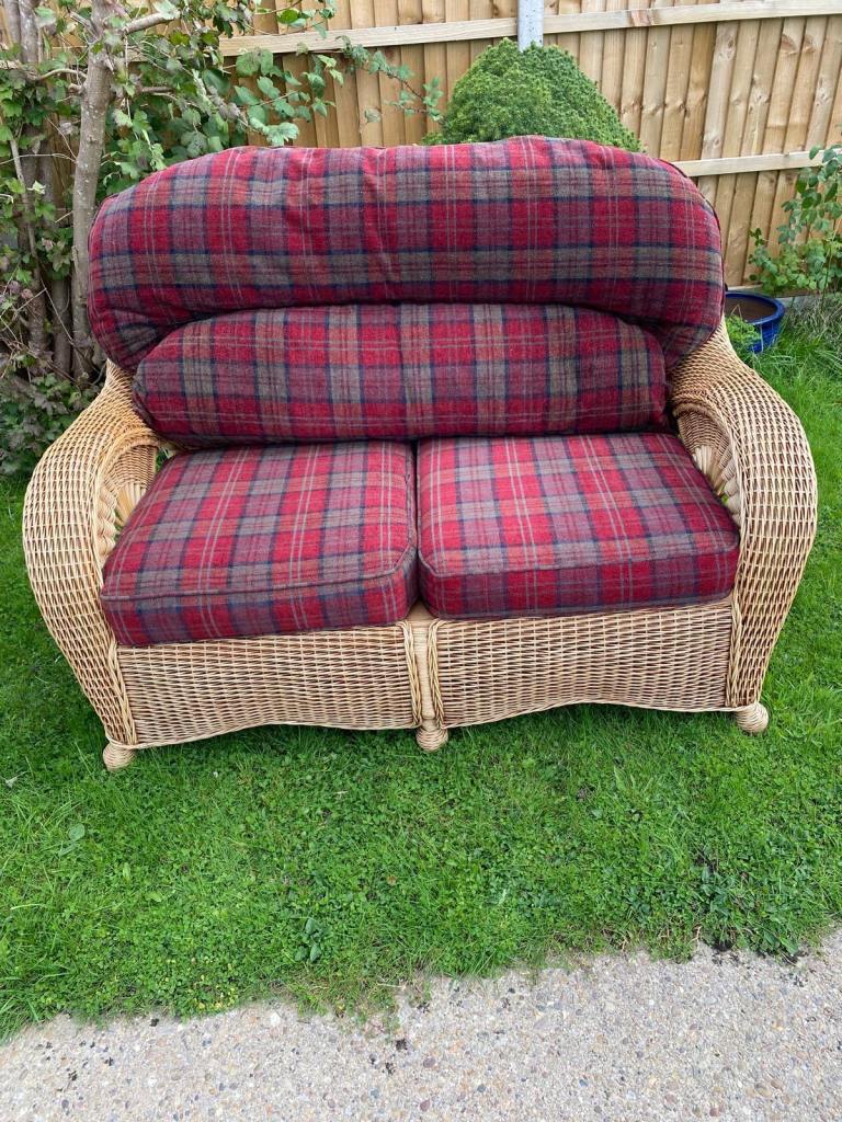 For sale, one wicker two seater sofa and two armchairs. Recently reupholstered and in excellent condition.