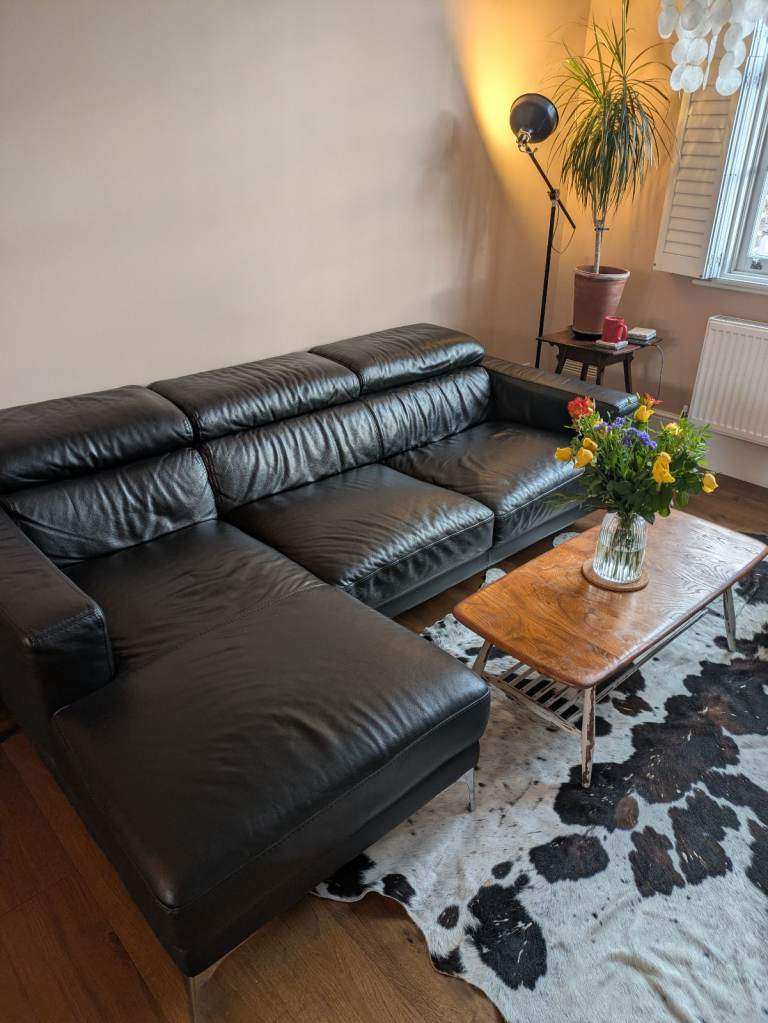 Beautiful and timeless mid-century real leather Italian L-shaped (right-armed) sofa with chrome legs. Head rests can be moved up and down. I’m told it was £5,000 new, I bought it as vintage (unknown brand) and we’ve had it for less than 9 months (child/pet/smoke-free home) but there are no signs of wear and tear. It separates easily into two segments for easy delivery. Collection only.