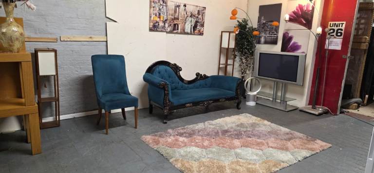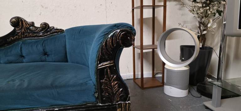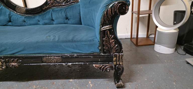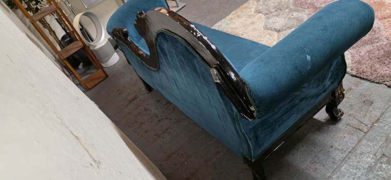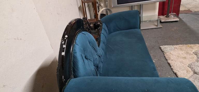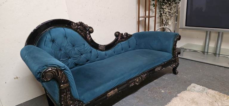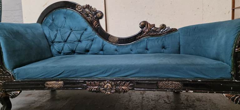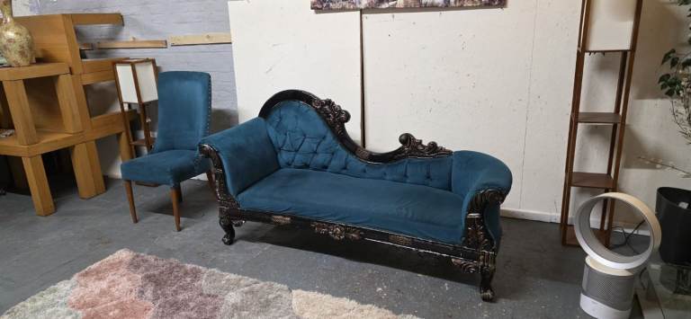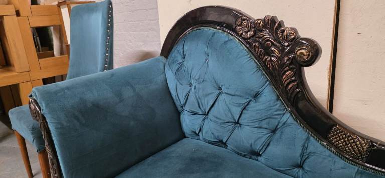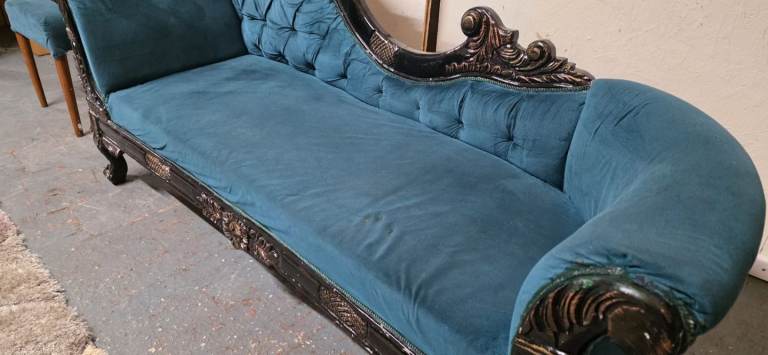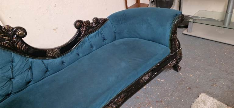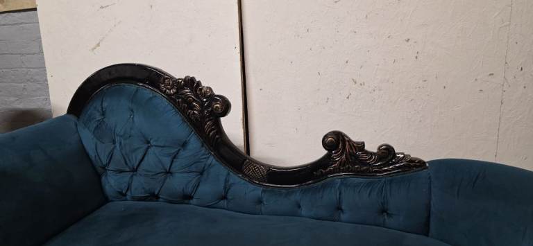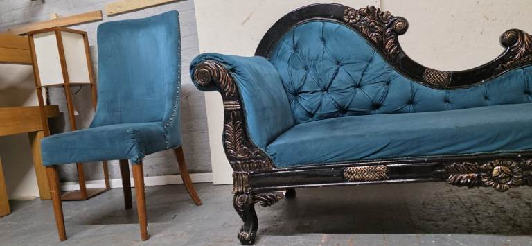 Recamiere Chesterfield Chaise Longue With Hand Carved Wooden Frame. Teal fabric. Perfect for any situation. With matching chair. Collection welcome. Delivery may be possible.