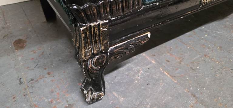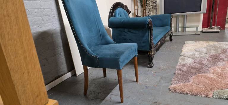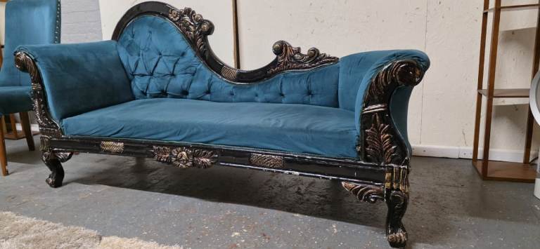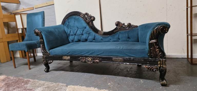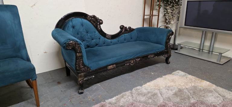Posting for 5+ yearsRecamiere Chesterfield Chaise Longue With Hand Carved Wooden Frame Salon Swan Sofa In Teal + Chair