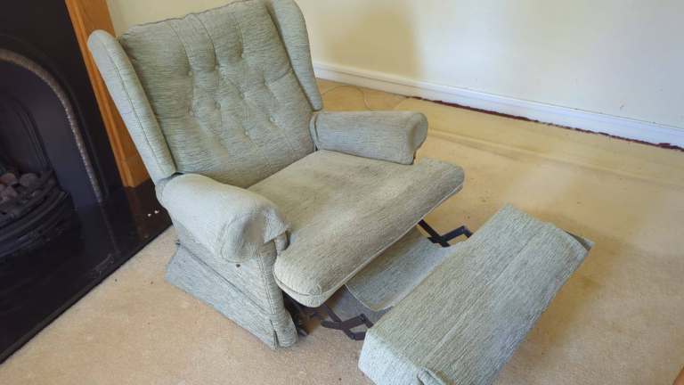 Manual recliner chair. Sage green. Comfortable and in good condition. Size upright : H 95cm W 85cm D 85cm