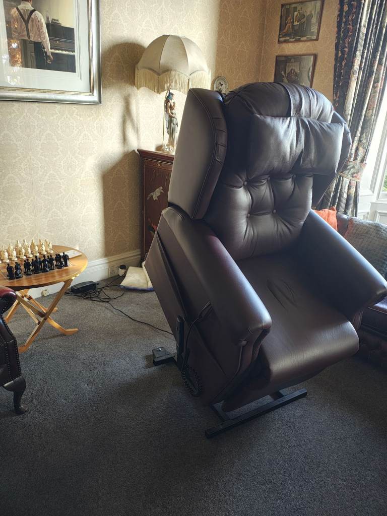 Motorised leather recliner/riser armchair. Excellent working condition, fair upholstery condition