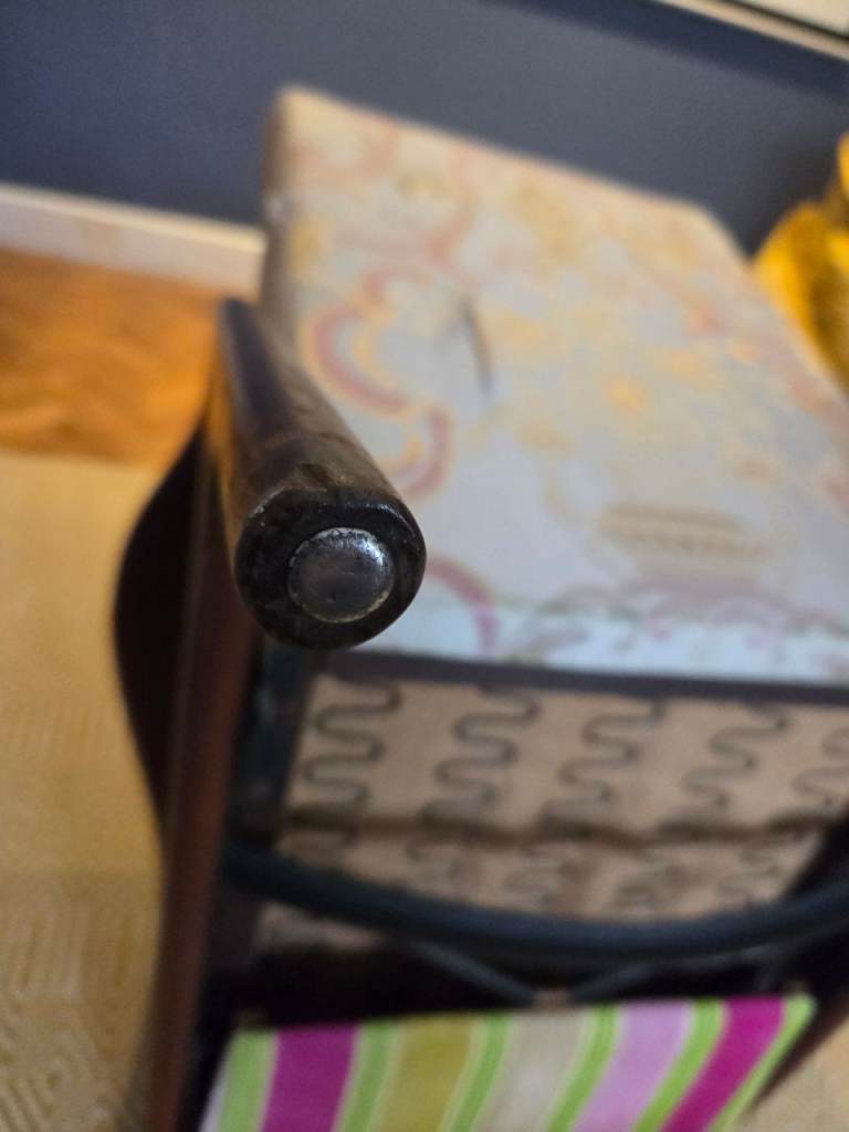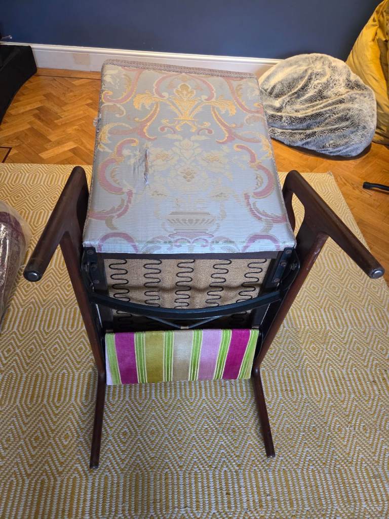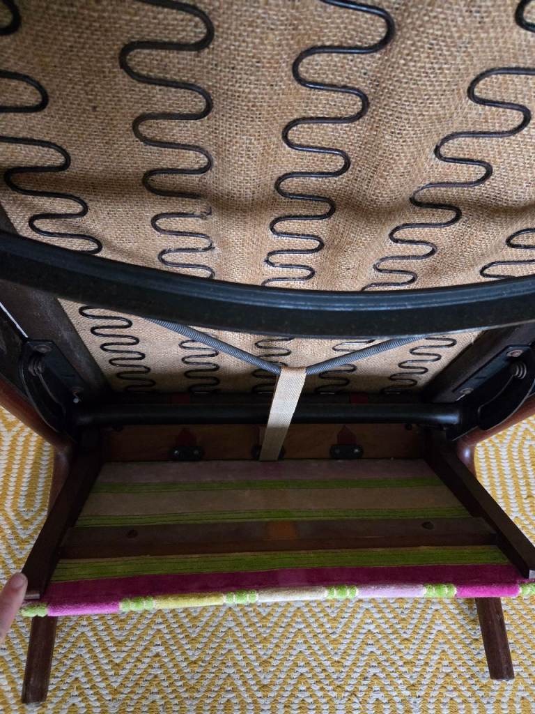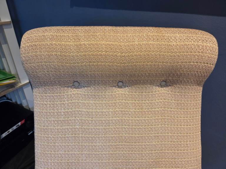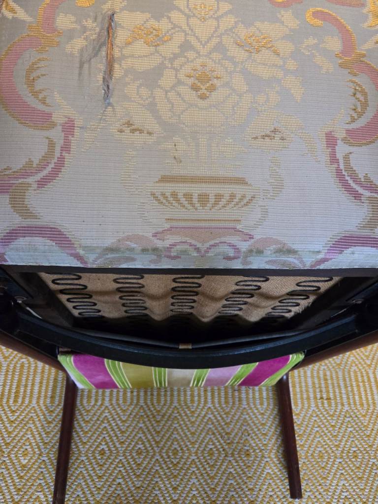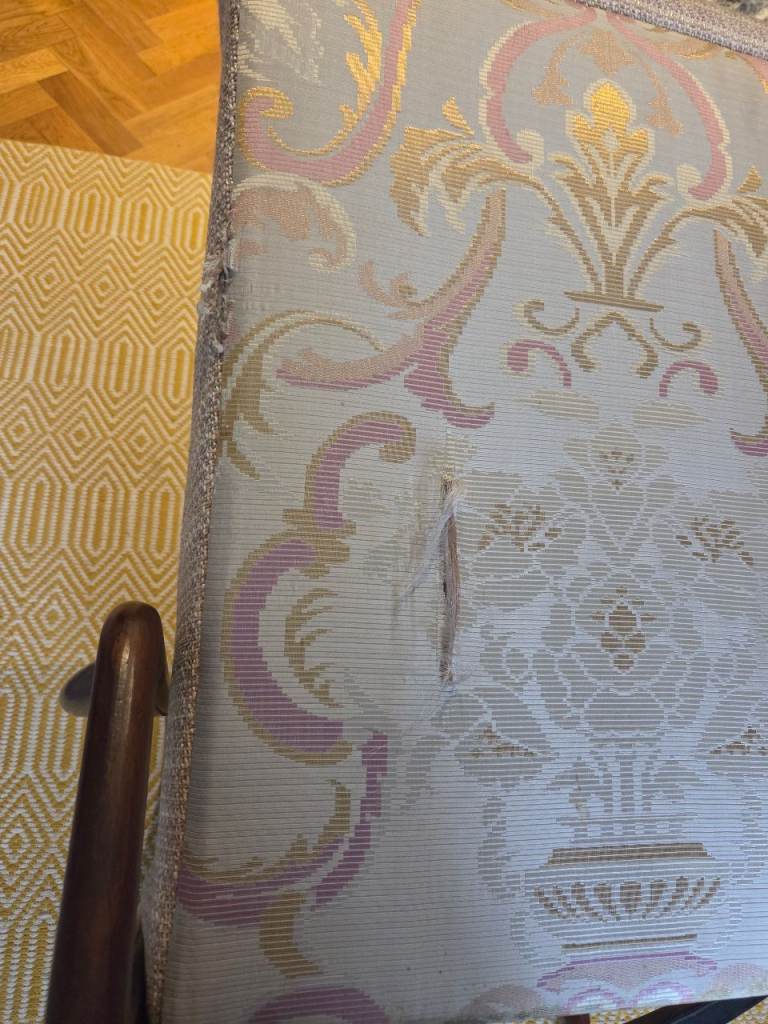 Note: At the back, there is one small seam fray and one frayed tear in the back fabric. Both shown in photos. A competent upholsterer ought to be able to replace back fabric or repair.