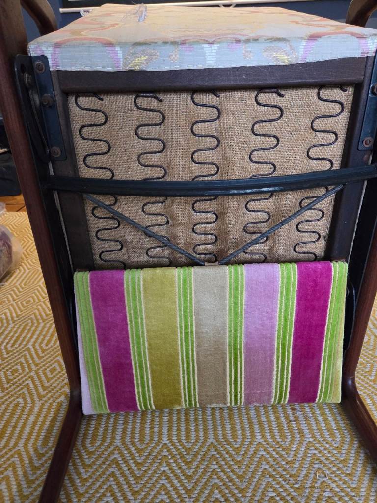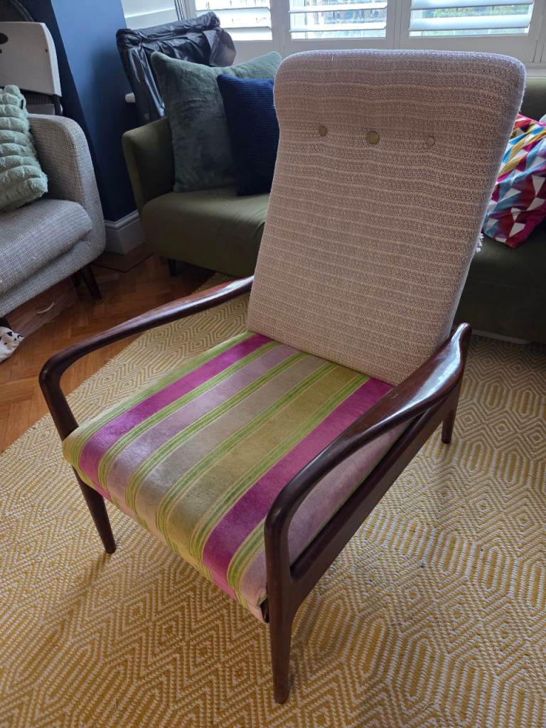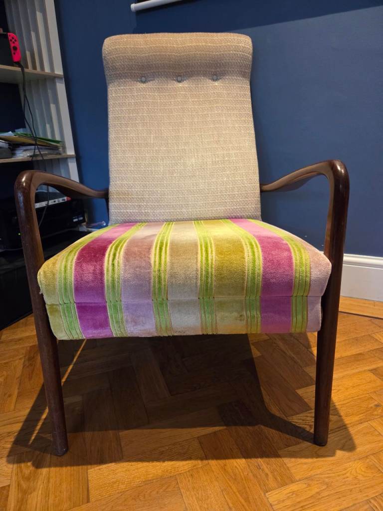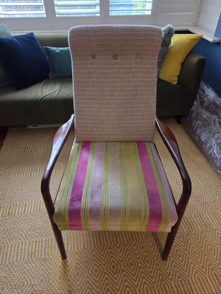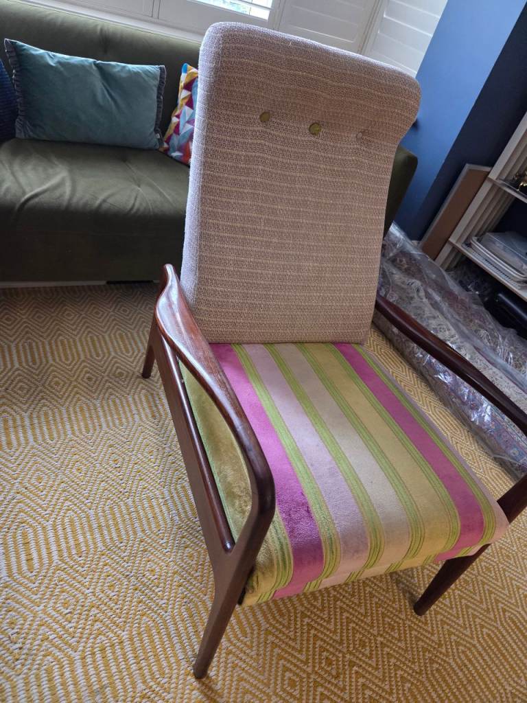 It was purchased directly from Designers Guild in London and only been lightly used since. The armchair is incredibly comfortable, upholstered in a stripe velvet (seat/footrest) fabric and a neutral woven fabric (back rest) with a gold thread running through.