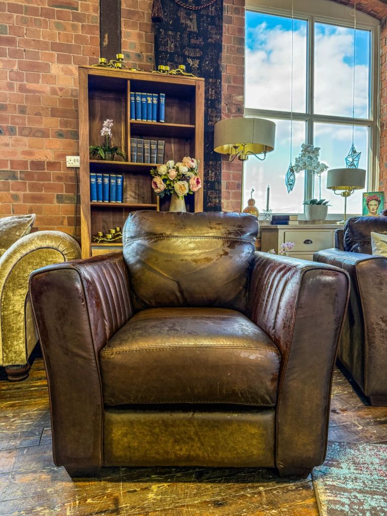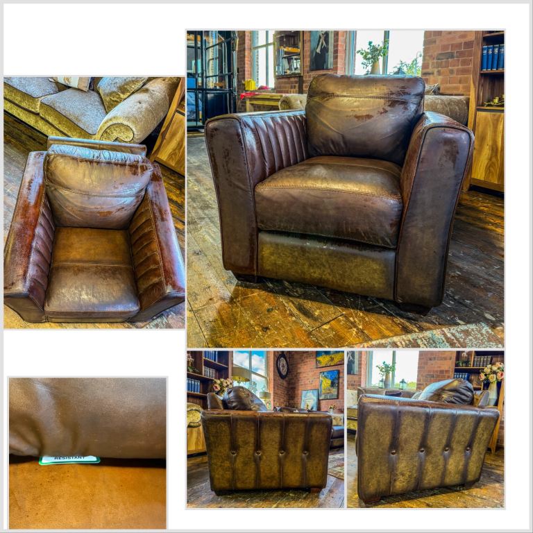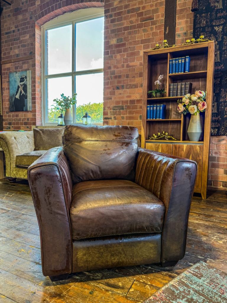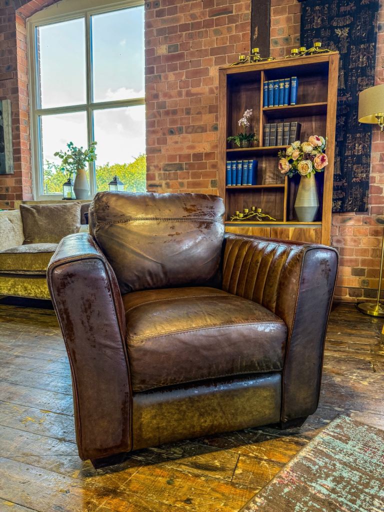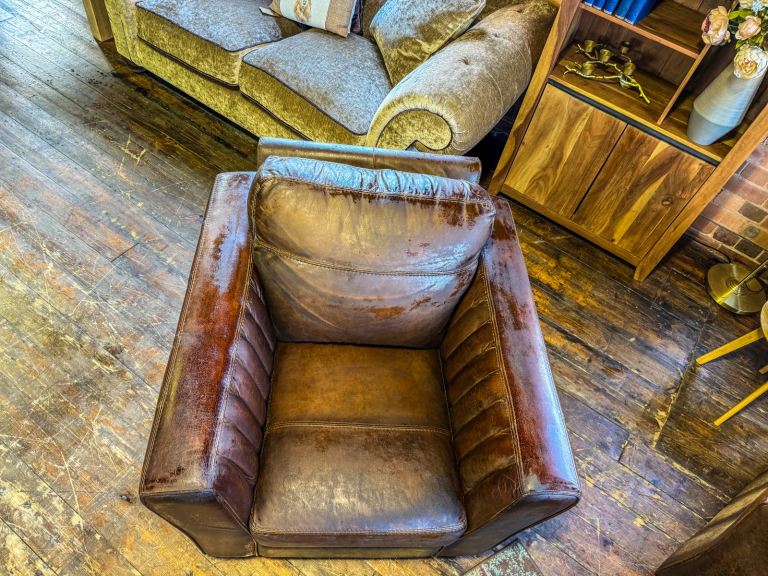 Unique, worn aviator jacket colour leather makes it look urban statement furniture.