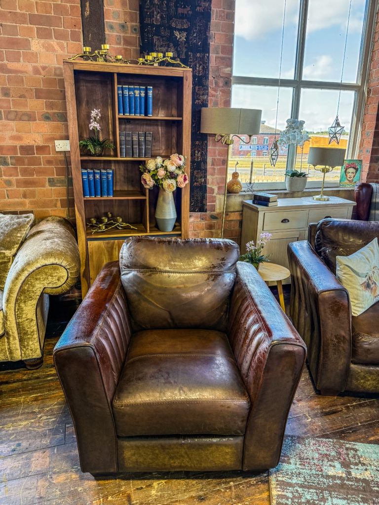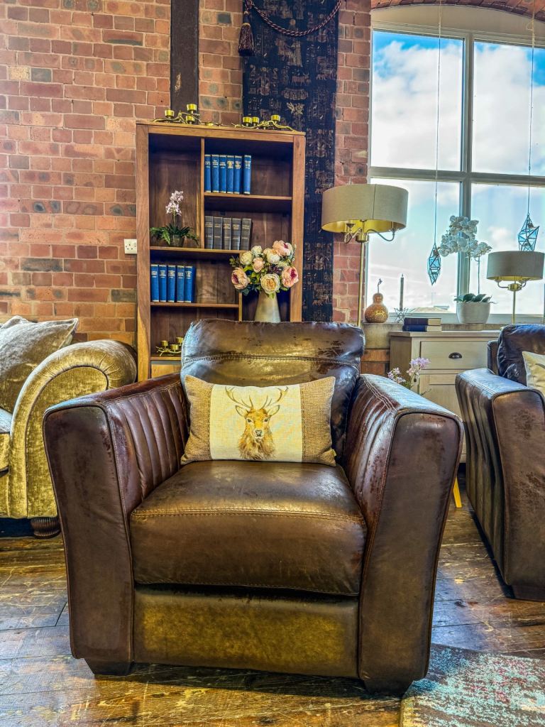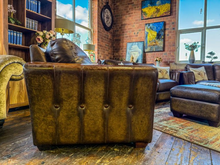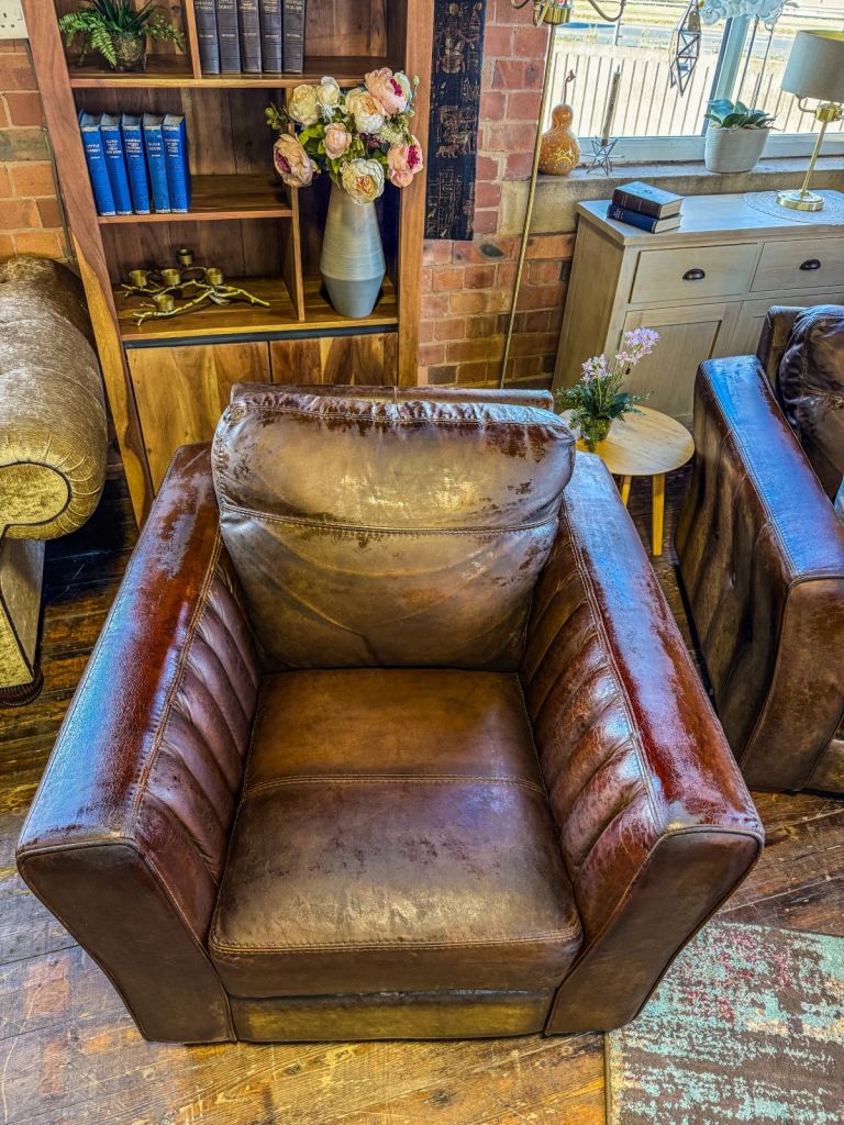 Unique, worn aviator jacket colour leather makes it look urban statement furniture.