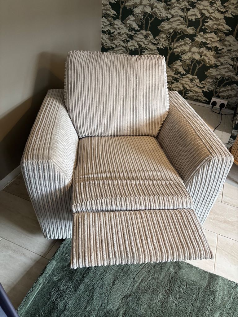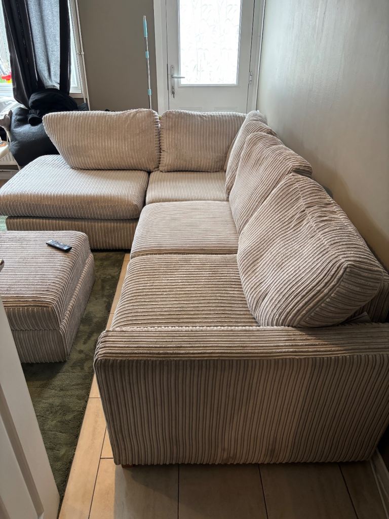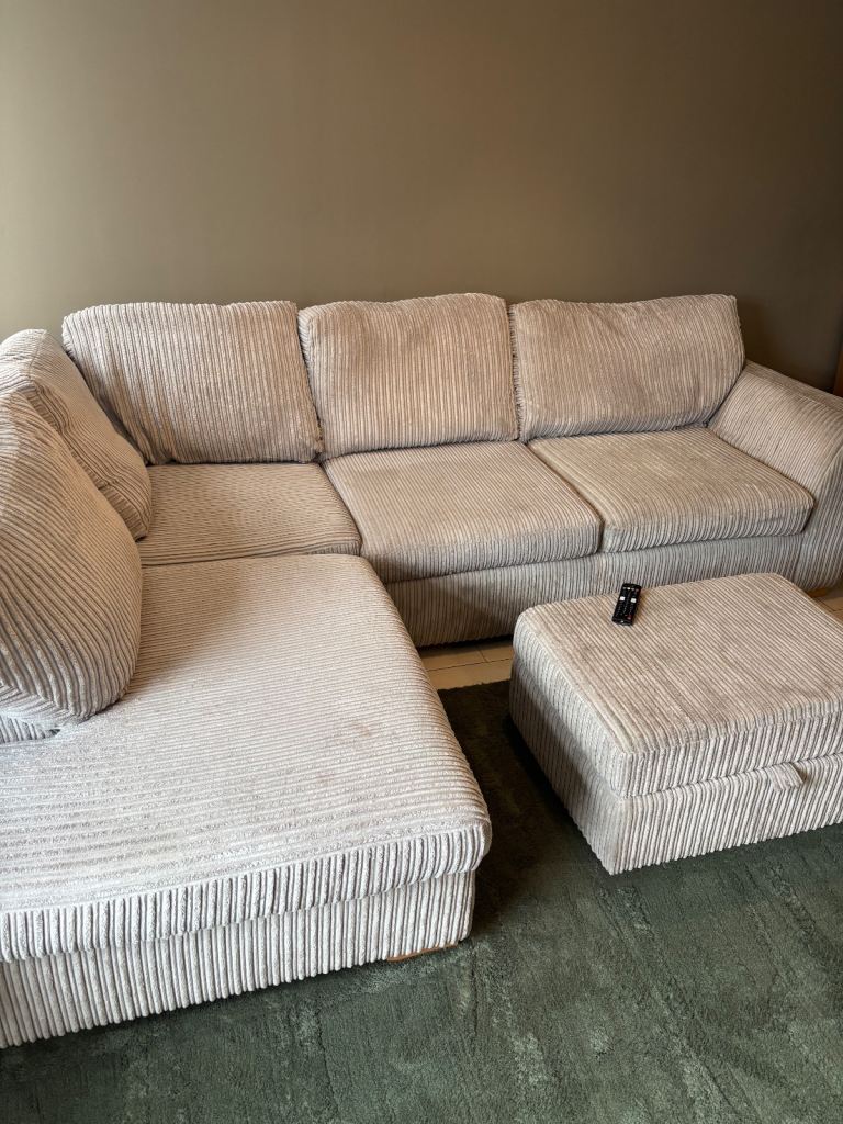 Selling my lovely beige jumbo cord corner sofa with matching ottoman footstool and an electric recliner section. The set is around 2 years old and has served me and my 5 children really well — still plenty of life left in it!