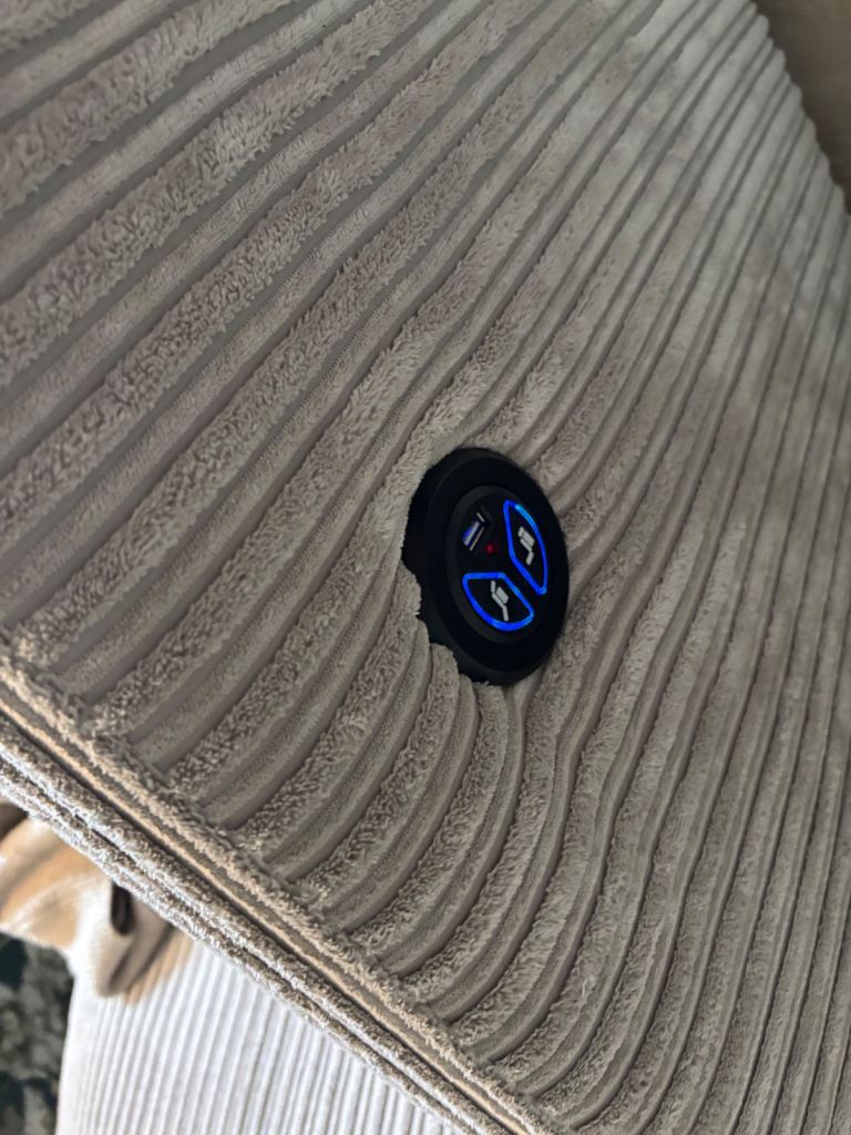 The electric recliner is practically new — it’s only been used once or twice and is fully working. While taking photos, I noticed a small bit of dried slime on the side (courtesy of one of my kids!). It’s barely noticeable unless you look closely. I haven’t tried to remove it, as I don’t want to risk damaging the fabric.