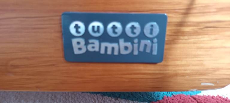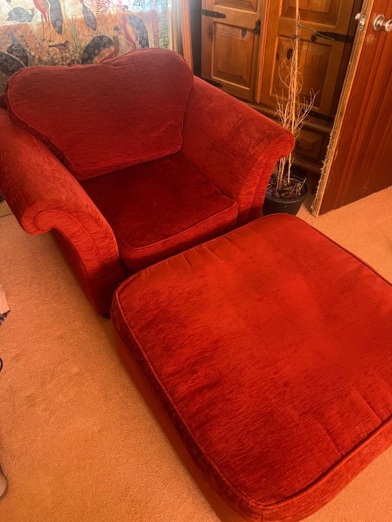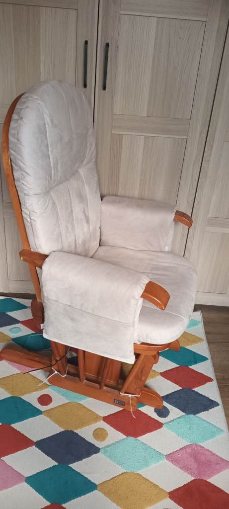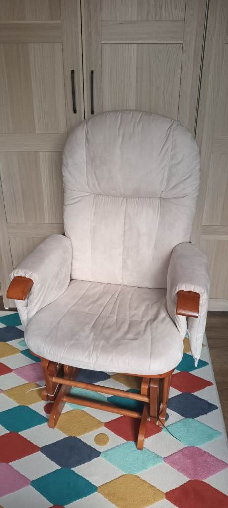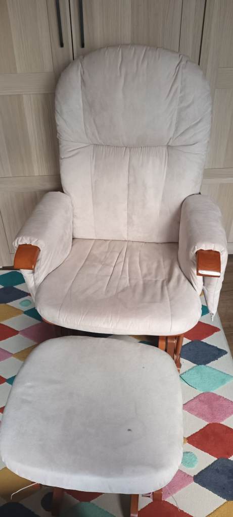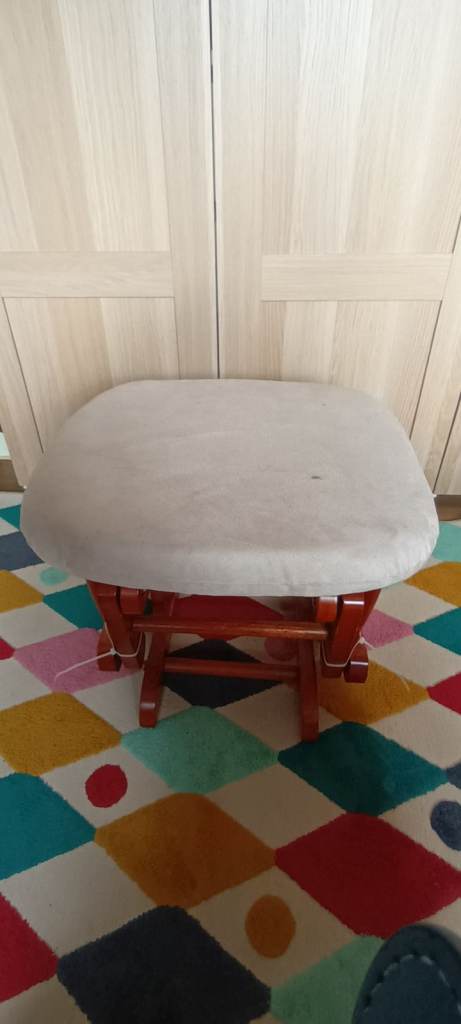 Rocking chair for a nursery with a matching rocking footstool. Frame wooden. The cover is removable. There is some markings as seen in the pictures.