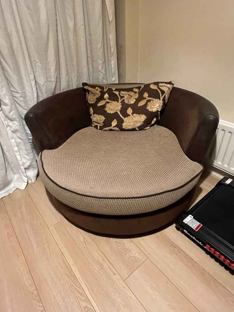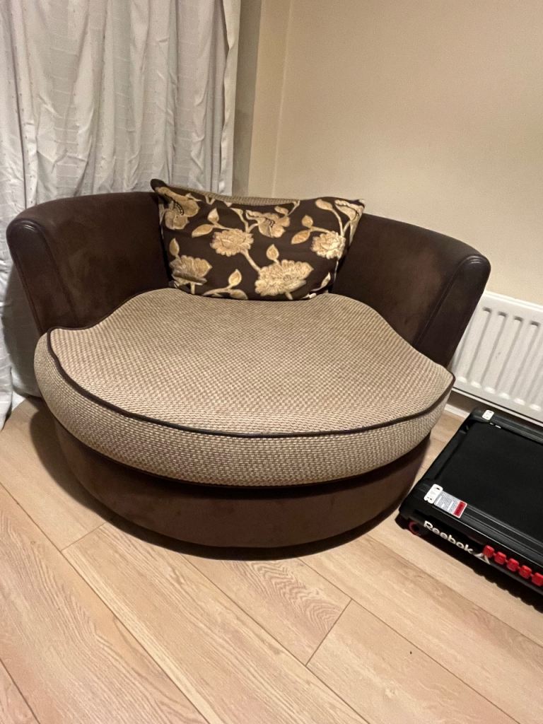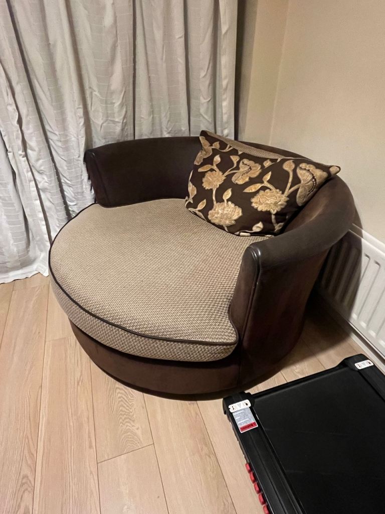 Round swivel sofa chair. In excellent condition .Been an addition to current setup so barely used . made in Brown Corduroy and faux leather. Collection only .open to offers.