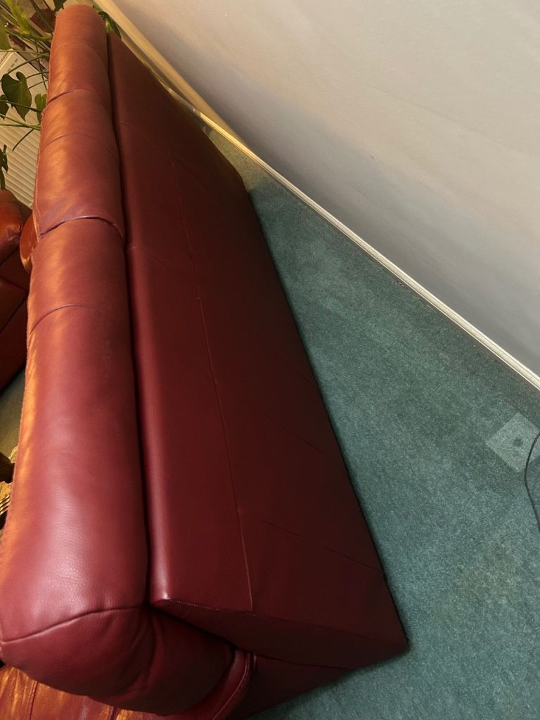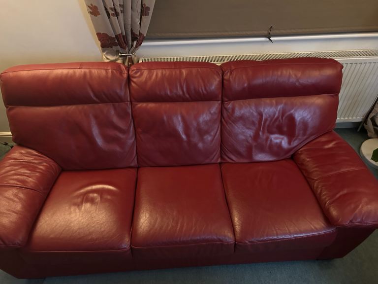 Here is an advert for a set of 2 identical three seater leather sofas from Harveys in red colour - in good condition.