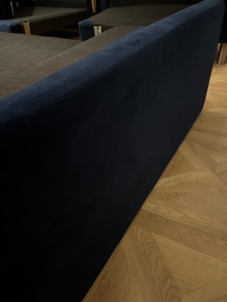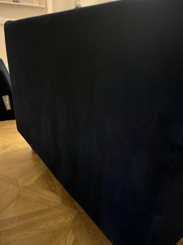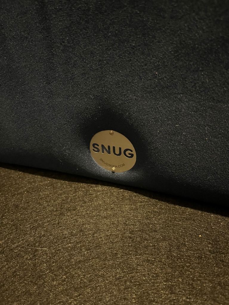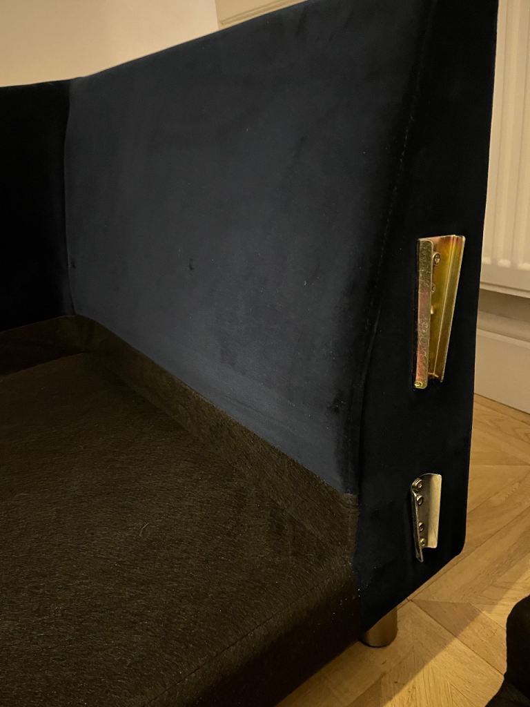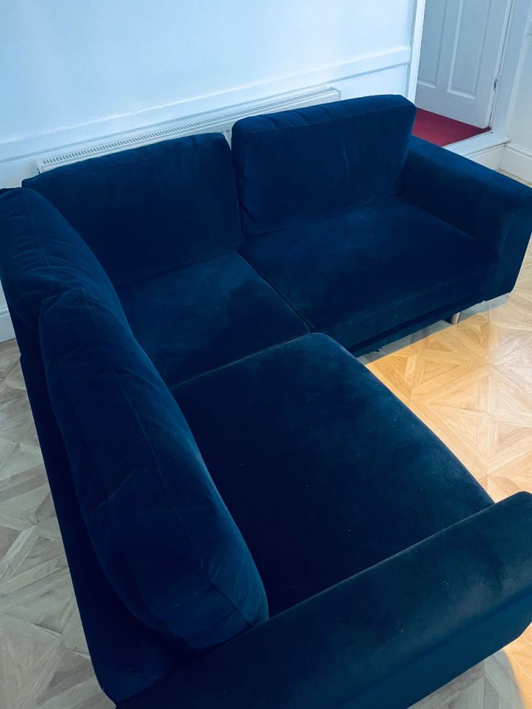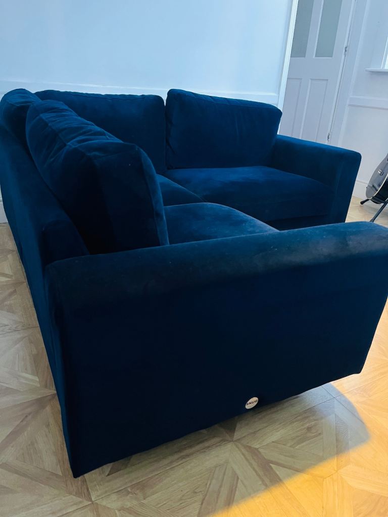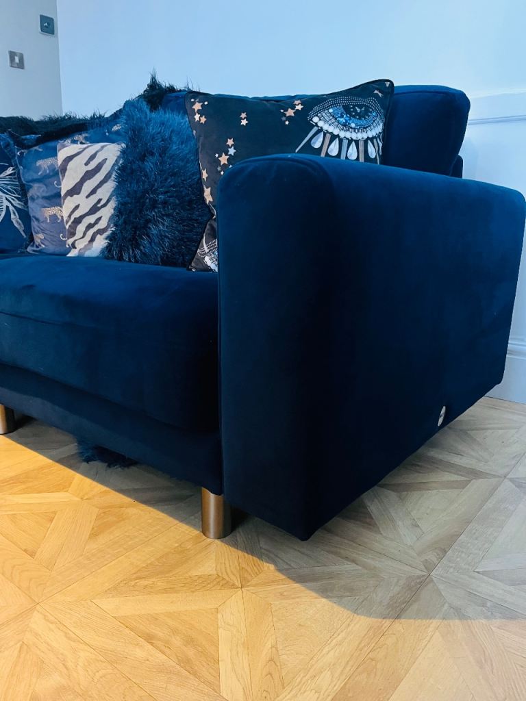 Snug - The Big Chill Corner Sofa Midnight Blue Velvet with metal bronze legs. In really good condition only used for 2 years SMOKE AND PET FREE. Click Lock system makes it easy to break down and manoeuvre into any room (which is the reason we originally bought it).