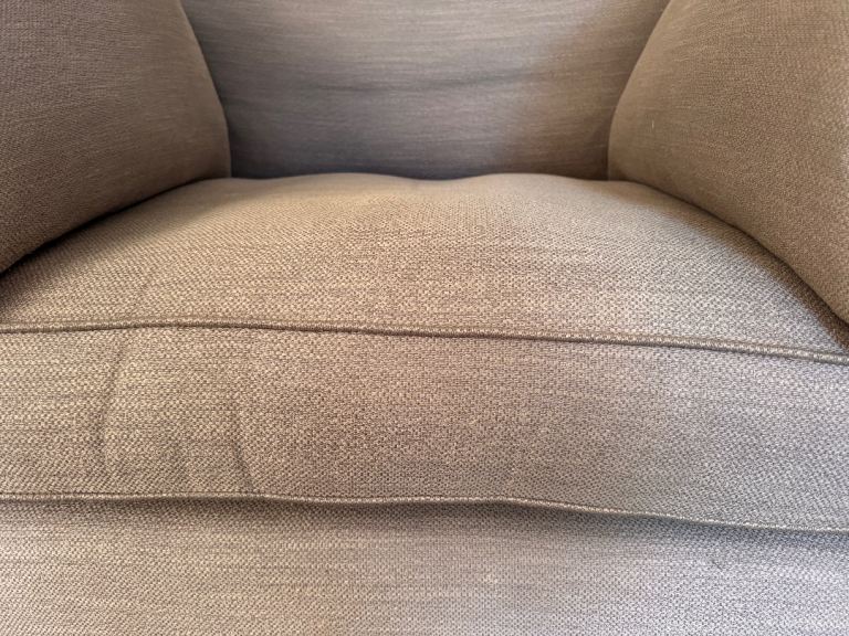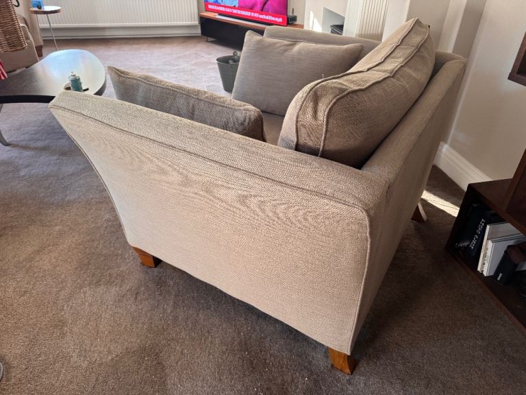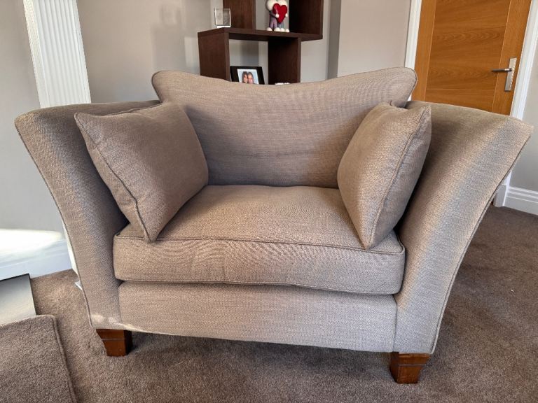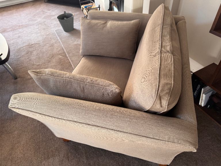 Sprung seat, luxurious cushioning and feather-filled arm bolsters.