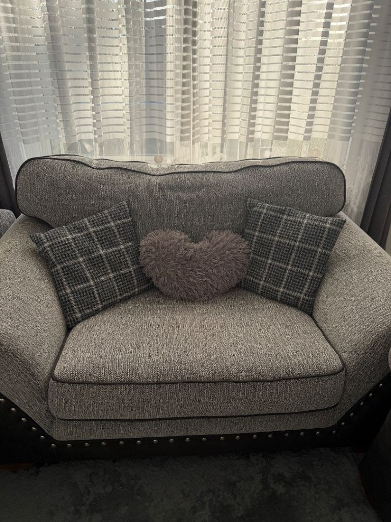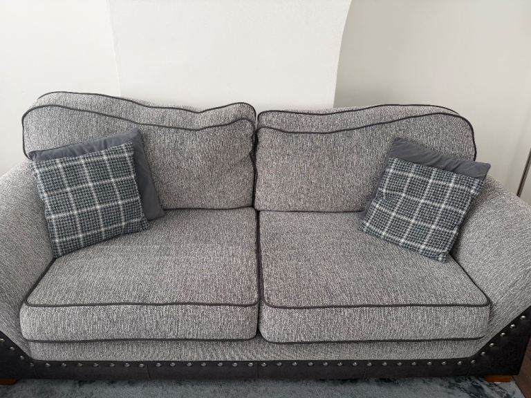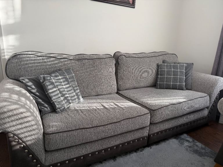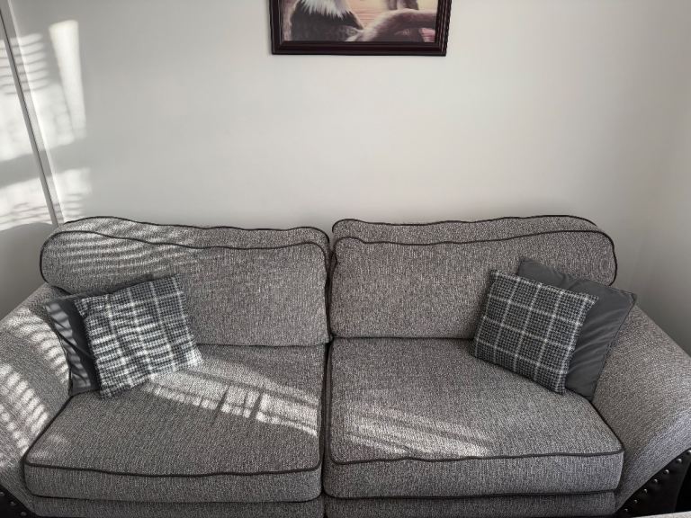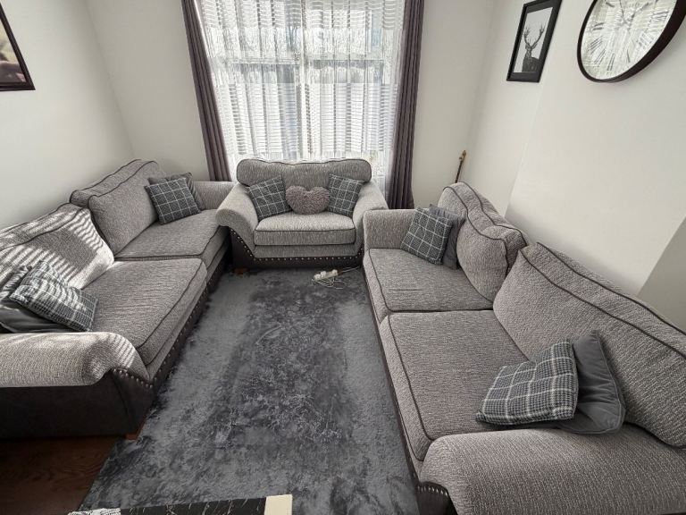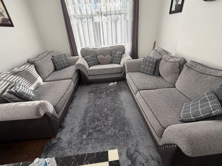 Selling a full matching sofa set in modern grey woven fabric with dark faux leather trim and stud detailing. Stylish, comfortable, and suitable for any living room.