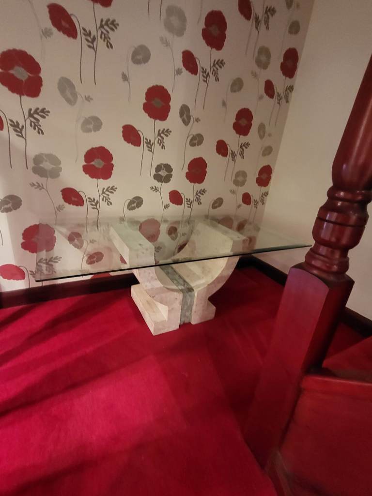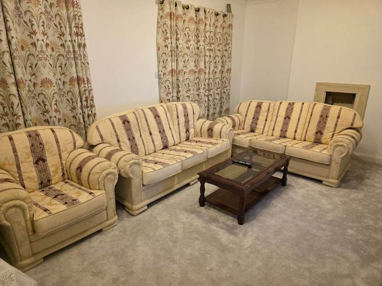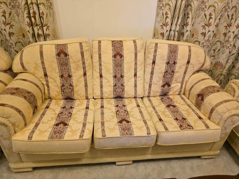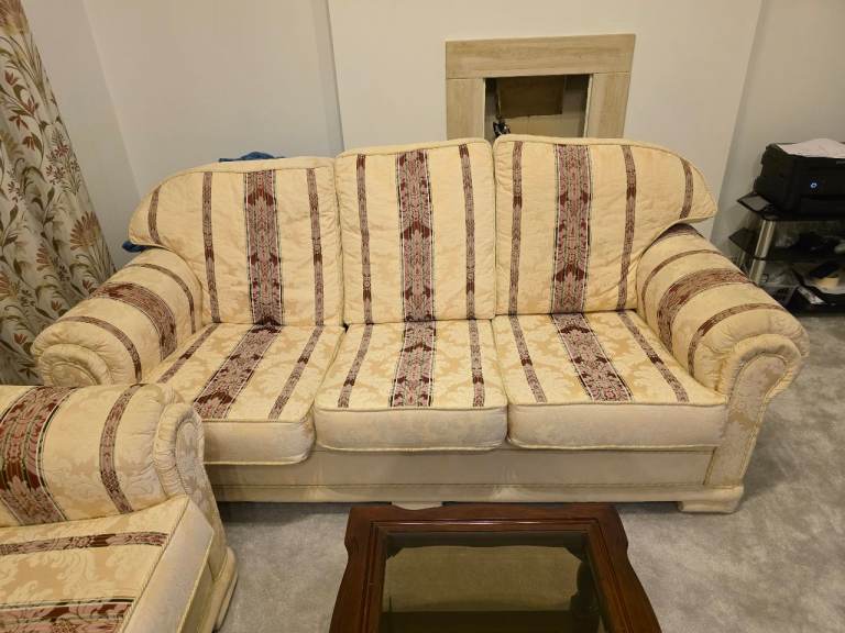 2 three seaters and 2 armchairs, very good condition, hardly used. Comes from a non smoking house. Cream with red pattern design. Price negotiable and pickup only