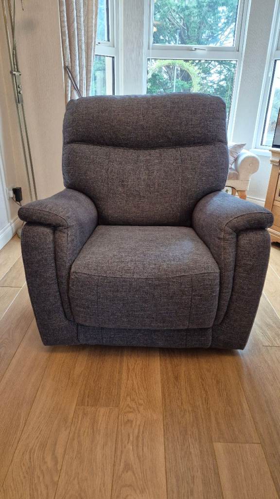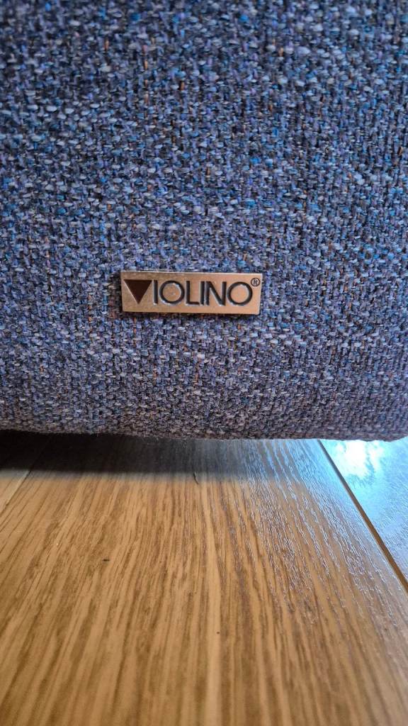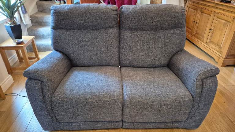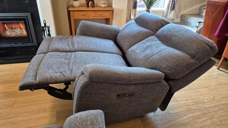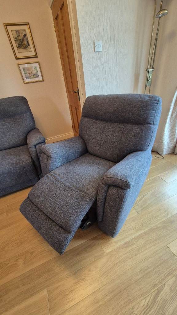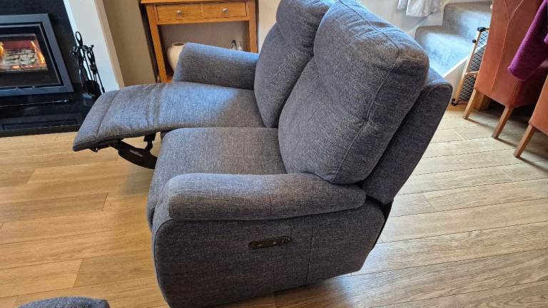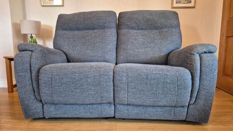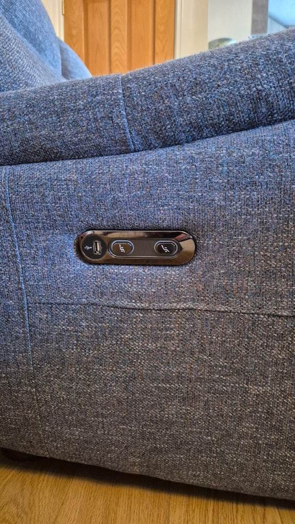 Blue fabric sofa suite. 2 + 2 + 1. Very good condition. All seats fully electric reclining and including USB A charging points.