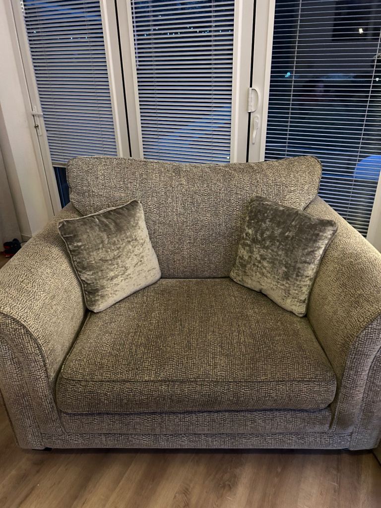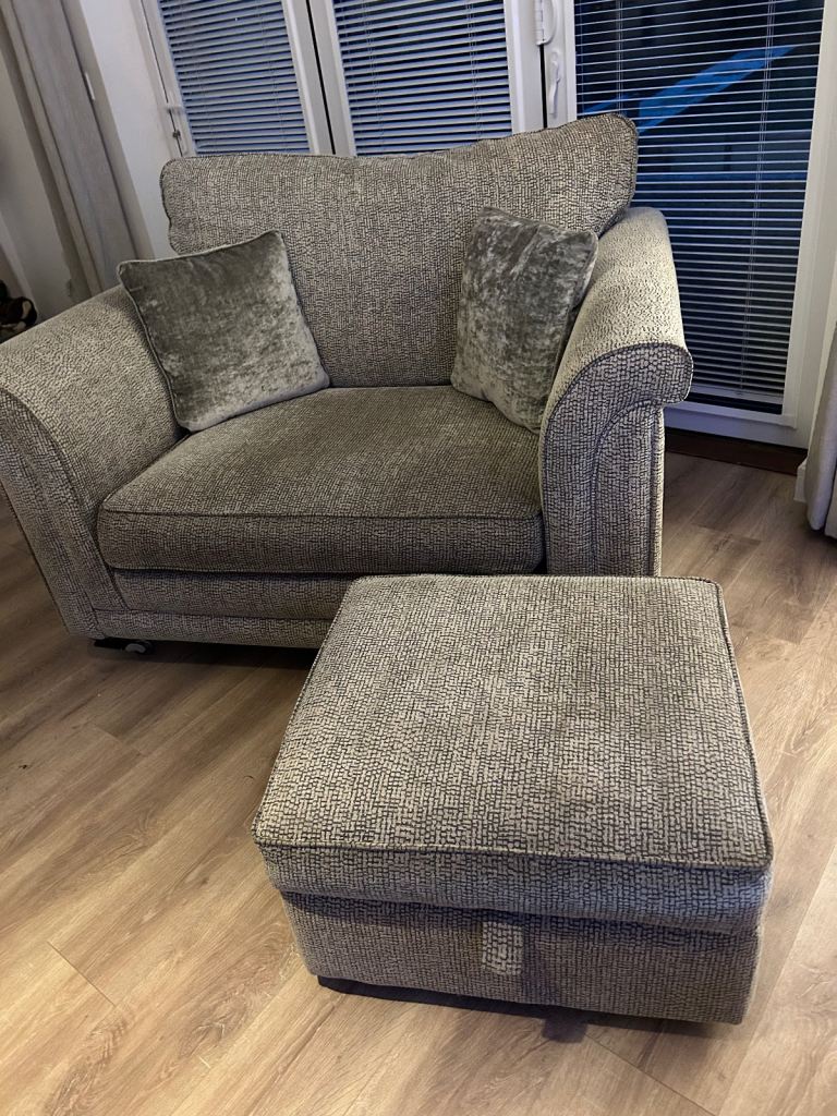 Beautiful Sturdy modern 3 seater couch, grey and beige check, 2 seater cuddle chair and large storage foot stool. Bought from Sterling Warehouse, 4 years old and in excellent condition. £700 Ono nearest offer. Buyer uplifts