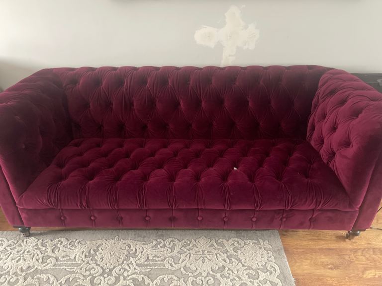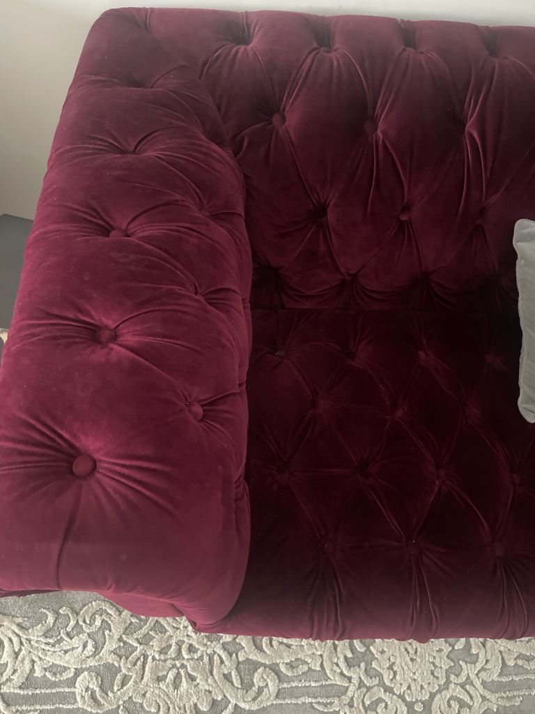 Plush deep burgundy tufted velvet sofa in excellent condition, featuring a classic Chesterfield-inspired design.