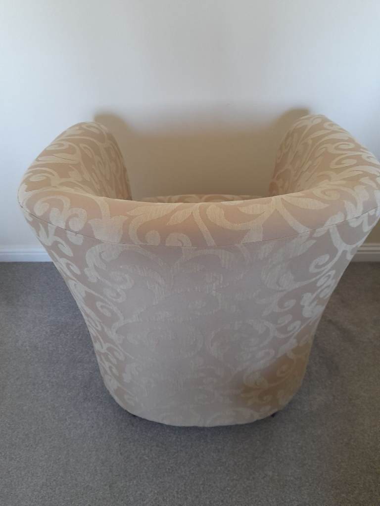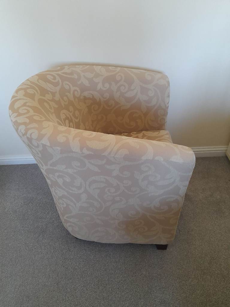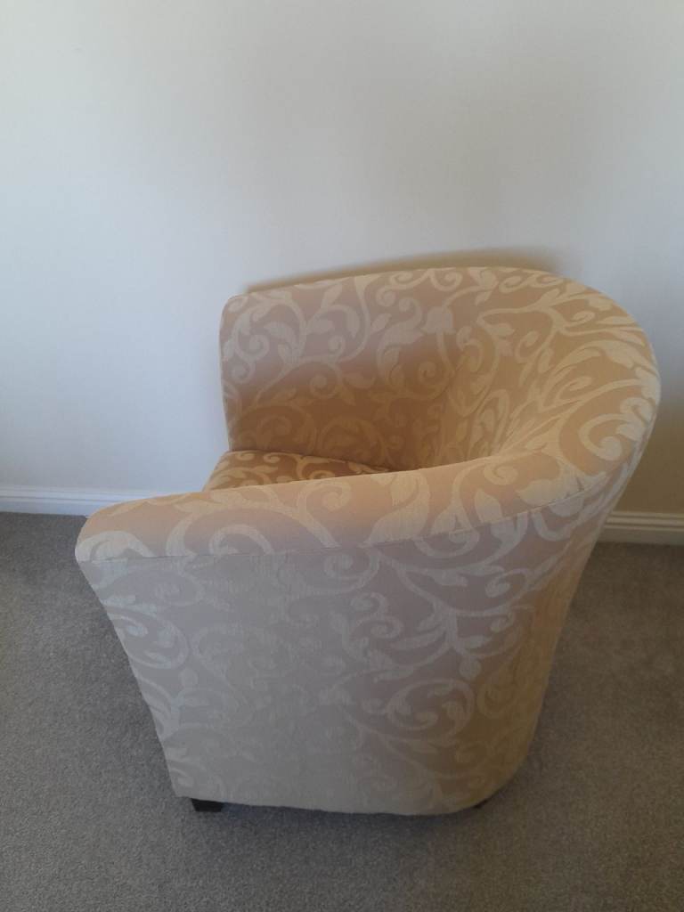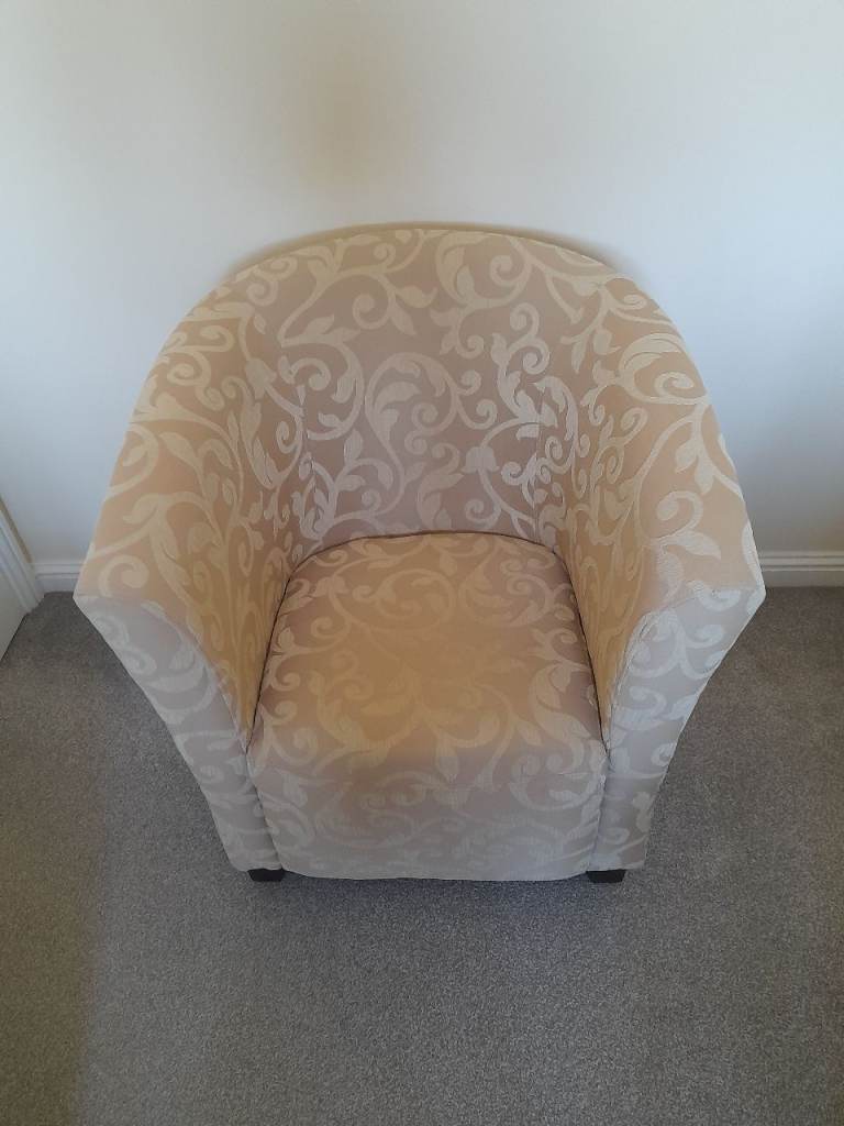 Light fawn coloured tub chair with embossed pattern. 80 cm high x 74 cm wide x 70 cm deep. In excellent condition and of very good quality, purchased from ward bros Doncaster a few years ago, cash on collection.