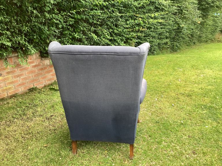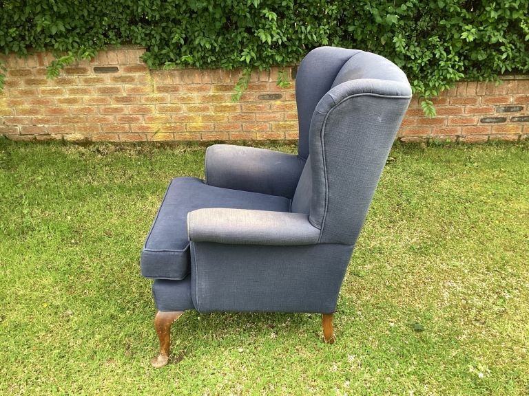 Blue, structurally in great condition, in great need of refresh/recover as the upholstery is tired looking.