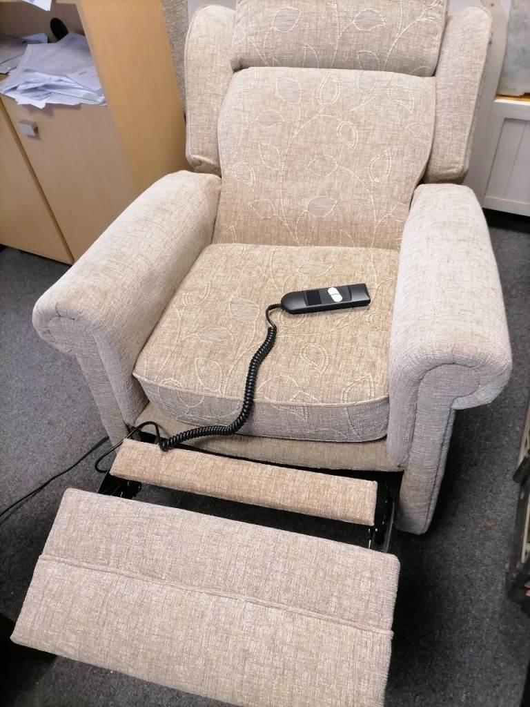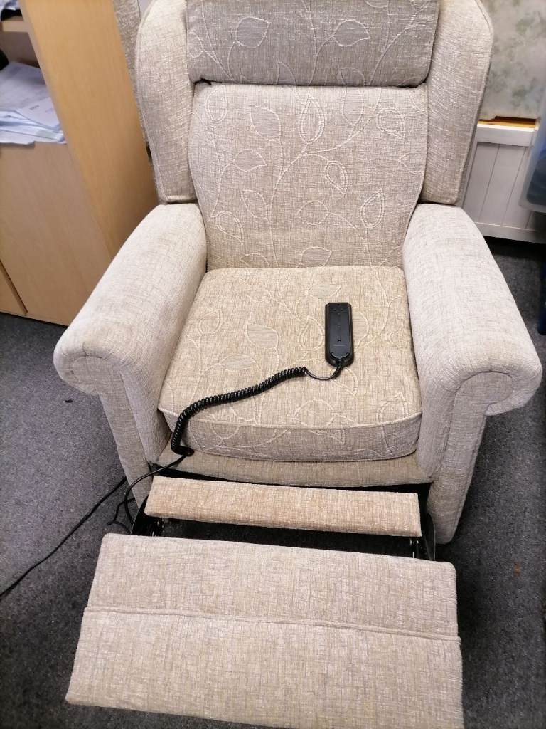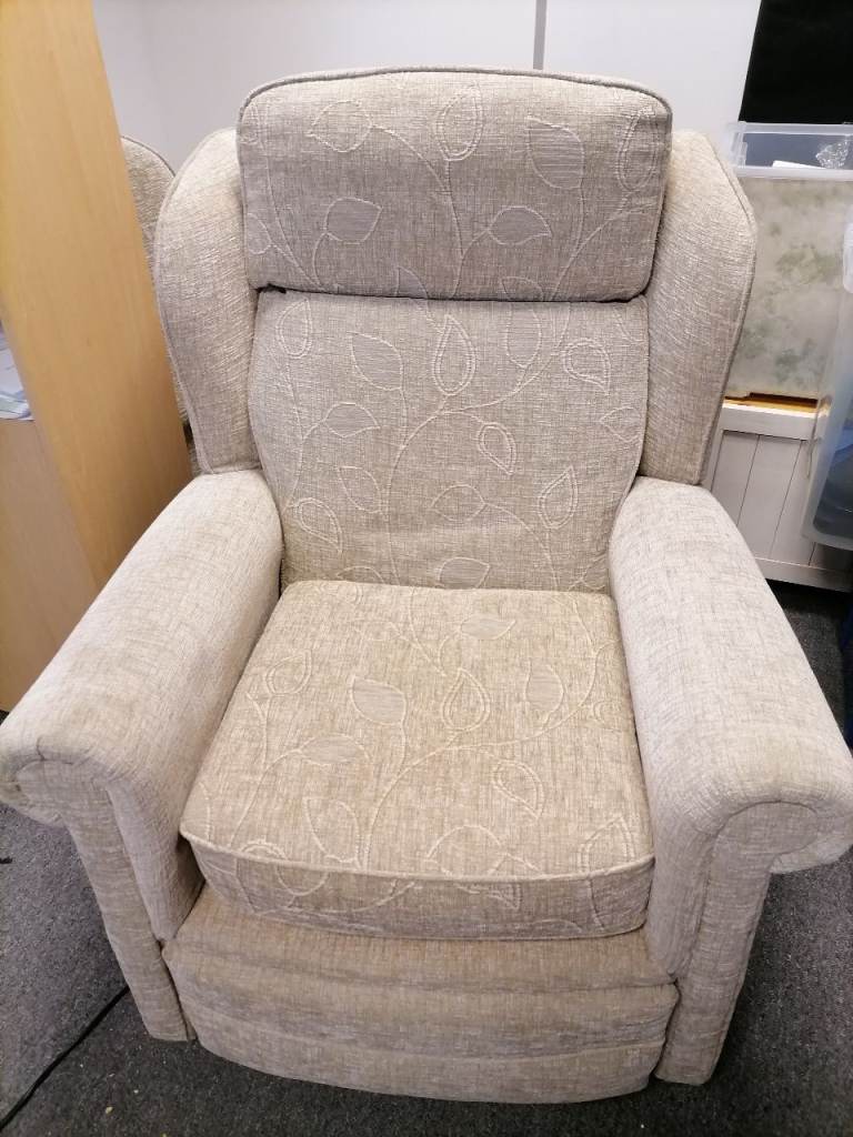 Wingback cream reclining armchairs x 2 in good condition. One has an electric motorised operation