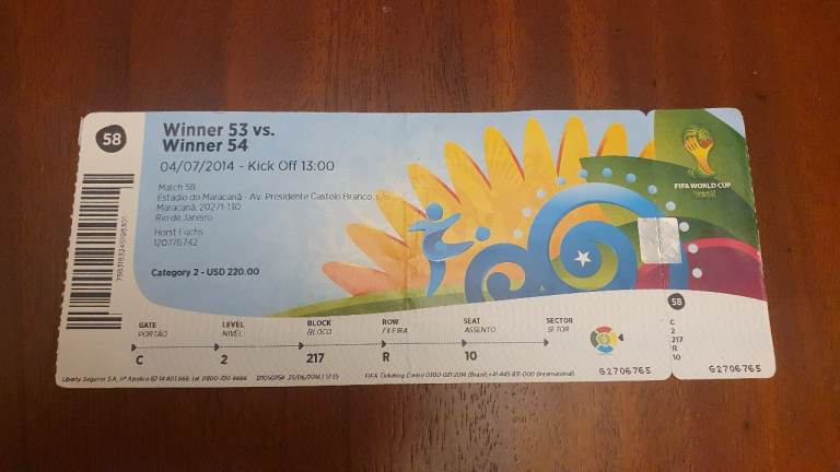 Original match ticket from the 2014 FIFA World Cup in Brazil.
