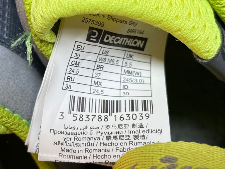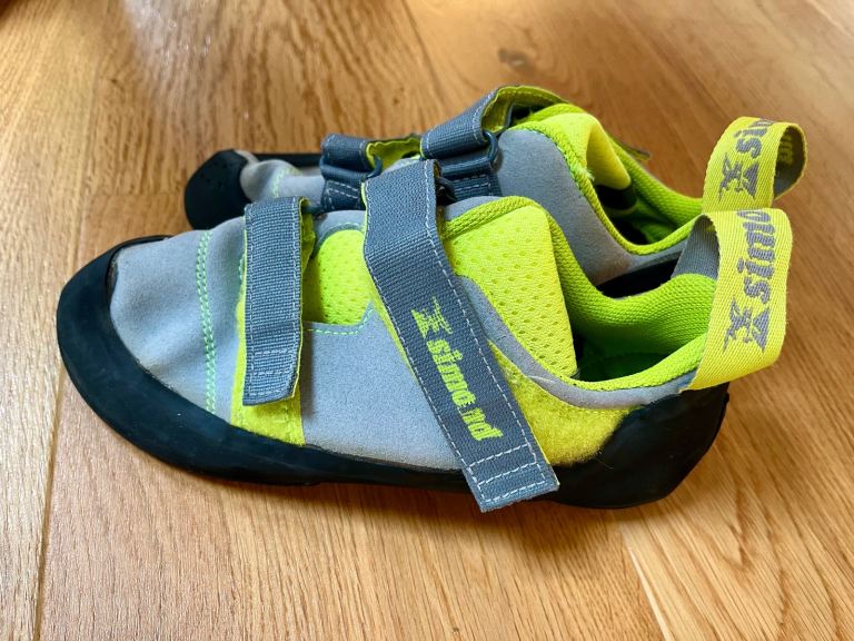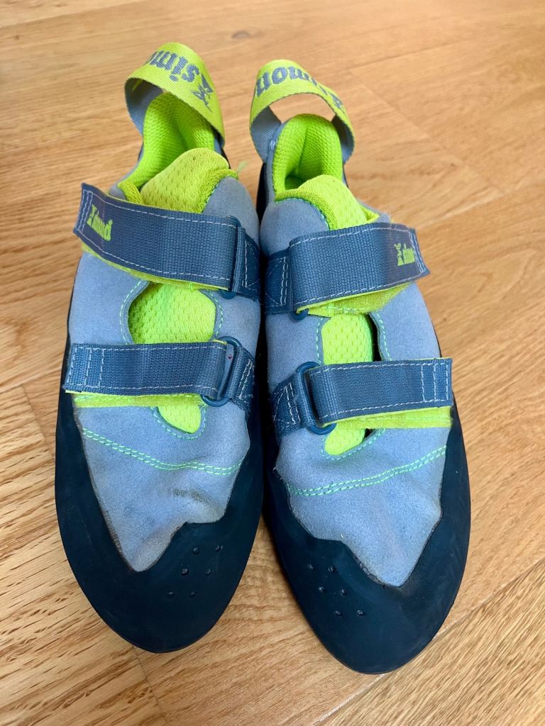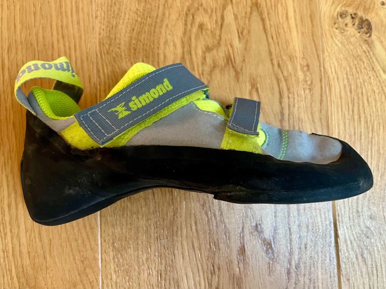 This is a pair of neon yellow and grey Simond climbing shoes that are UK 5.5 (adult). They have a fairly high arch, and have had limited use as our son grew out of them quickly! They are in excellent condition, with mild signs of wear and tear.