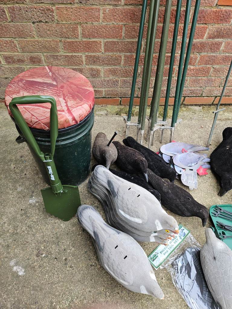FUD decoys, 9 hide poles, swivel bucket seat fold away spade, hide pole tray.