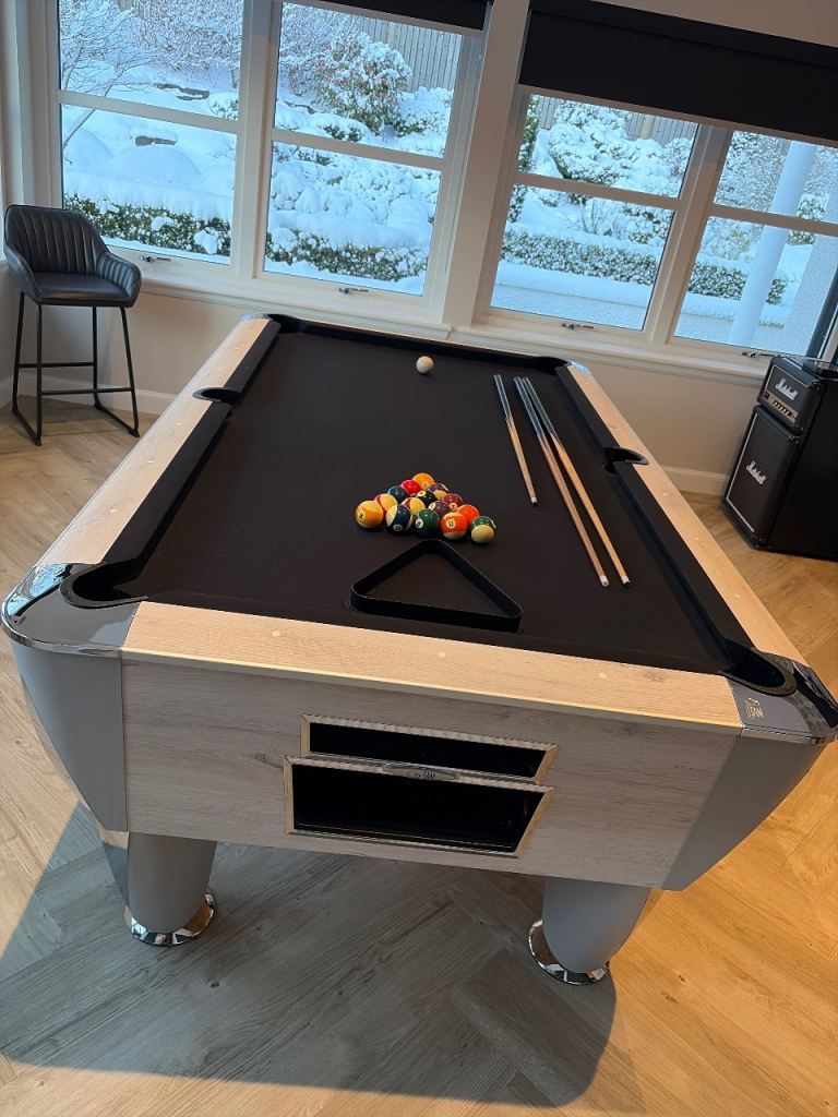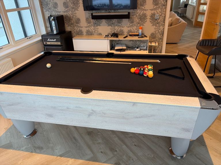 Sam Leisure Magna 7ft Champion Pool Table with black cloth. Around 5 years old and light usage. Comes with complete set of balls and three cues, one of which is shorter. All three need new cue tips. Slate bed. Purchaser to arrange dismantling and moving of table. Cost £3,000 new.