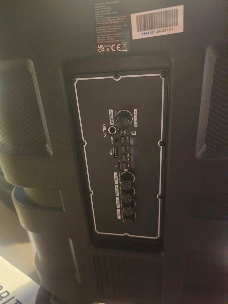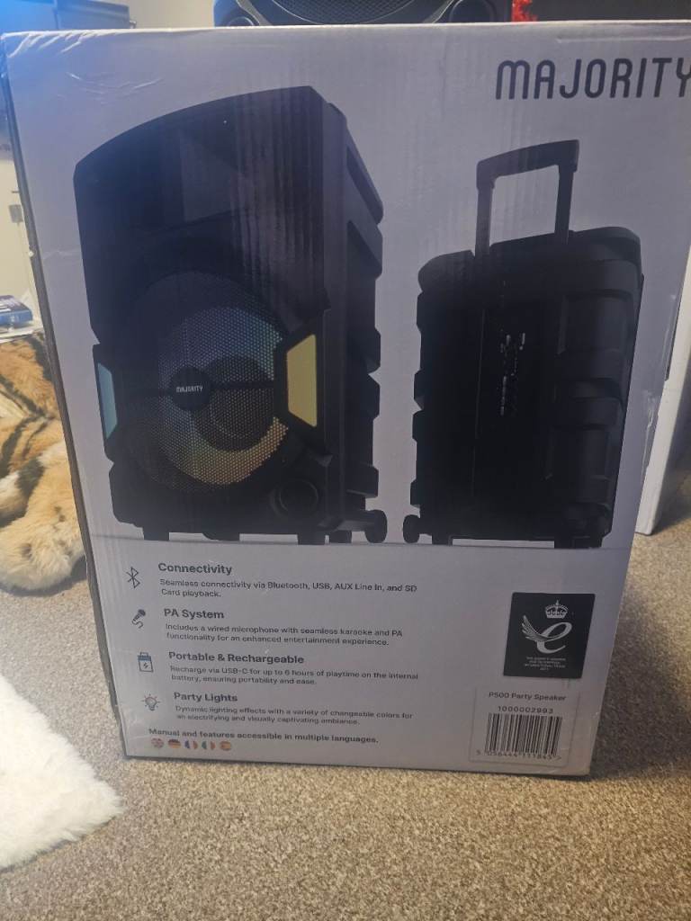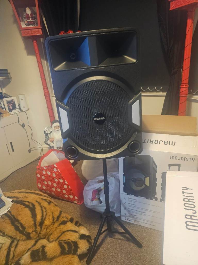 Bluetooth majority speaker brand new and boxed rechargeable and has flashing lights, comes with 2 microphones 1 cordless 1 wired and come with remote control and with stand, 1 has been opened to show how it looks