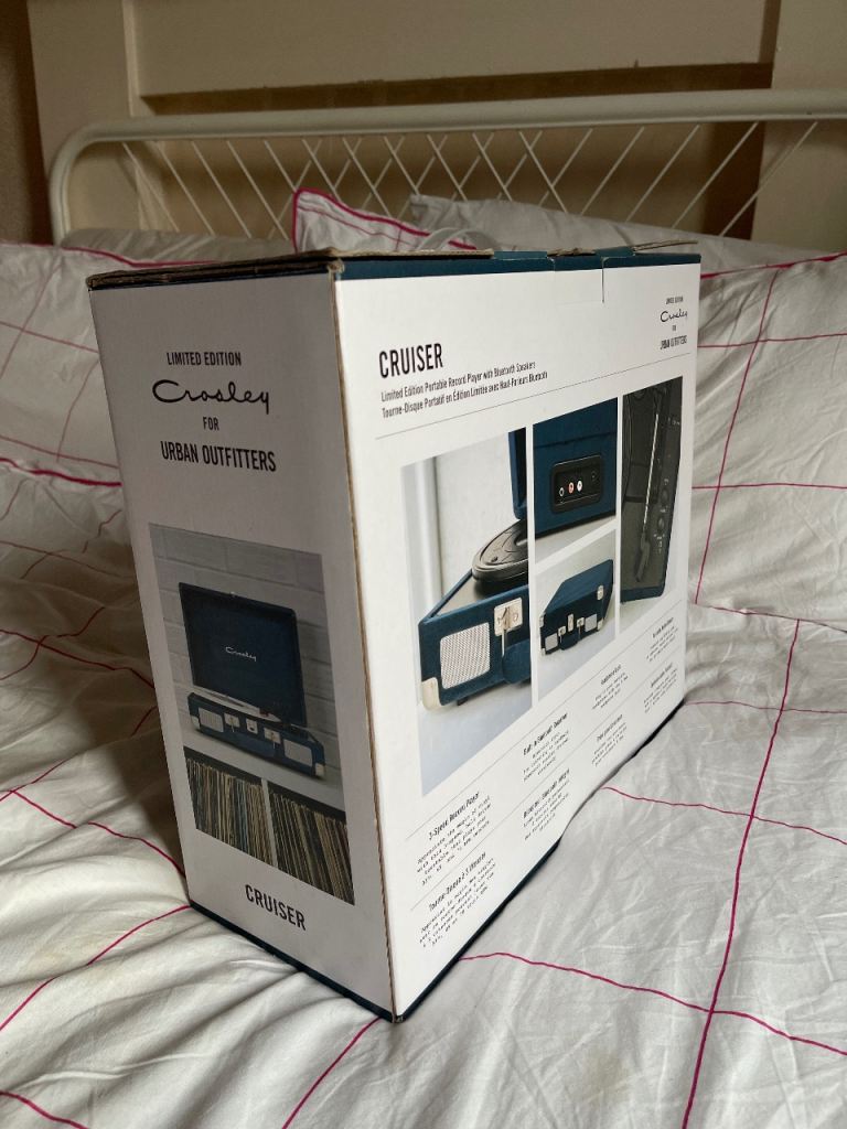 unused crosley blue velvet record player. comes with bluetooth, headphone jack and three speeds. still in the box with all the wires.