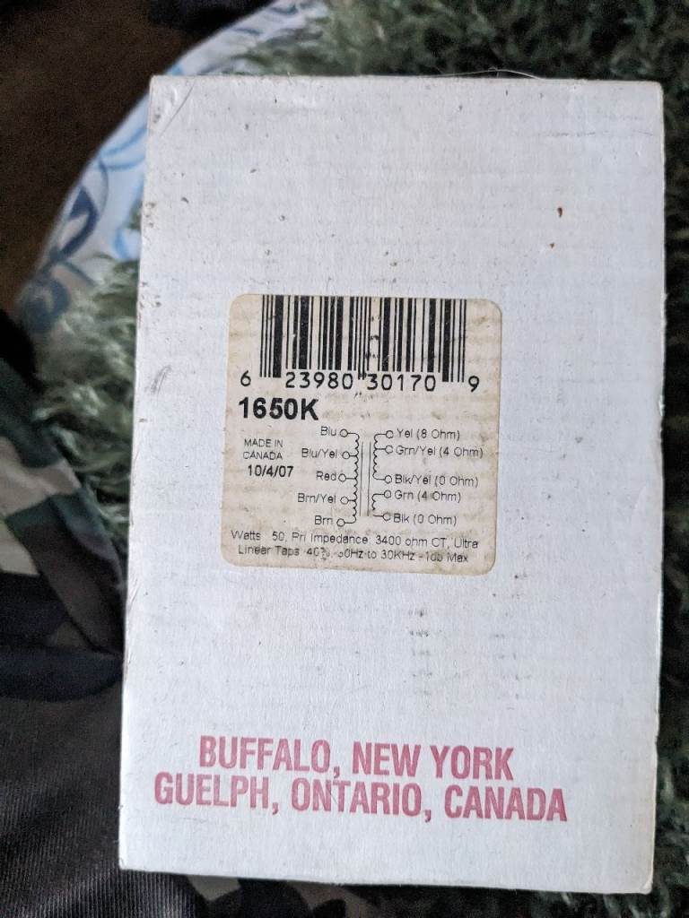 Boxed and unused Hammond 1650K Output transformer 50W 3K4 c.t. ultra linear taps 40% primary / secondary 0-4ohm tap plus 0-4-8ohm. (£110).