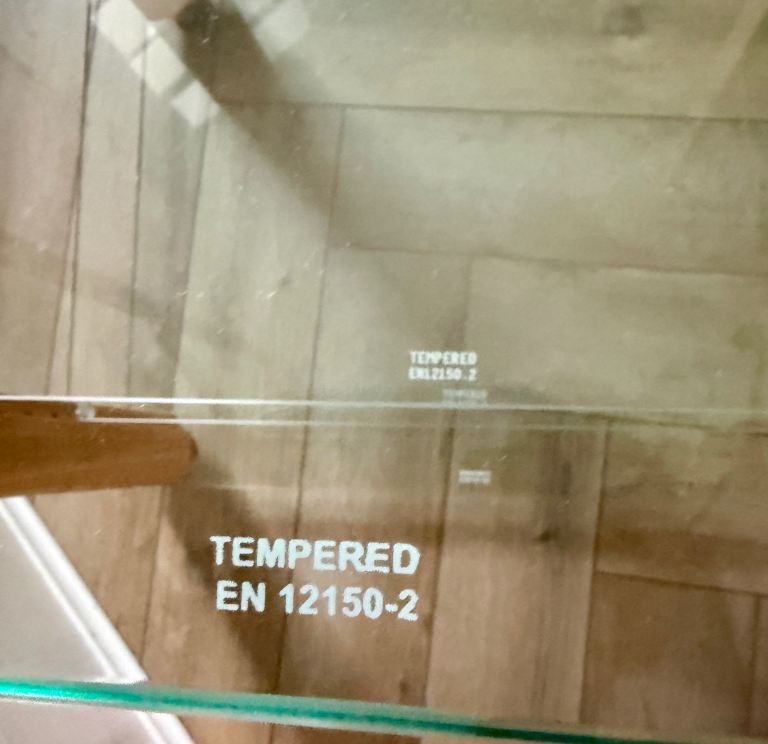 All shelves are tempered glass and the 2 middle shelves are adjustable.