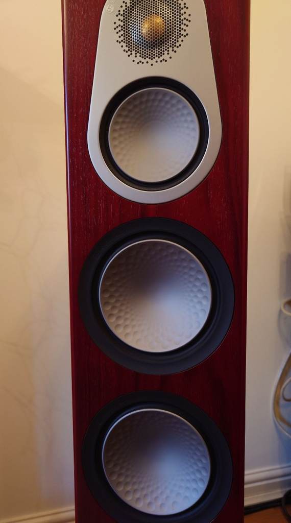 Monitor Audio Silver 300 floor standing speakers. Rosenut wood veneer finish. Gold dome tweeter, 4" mid-range drive unit and two 6" long throw bass drivers.