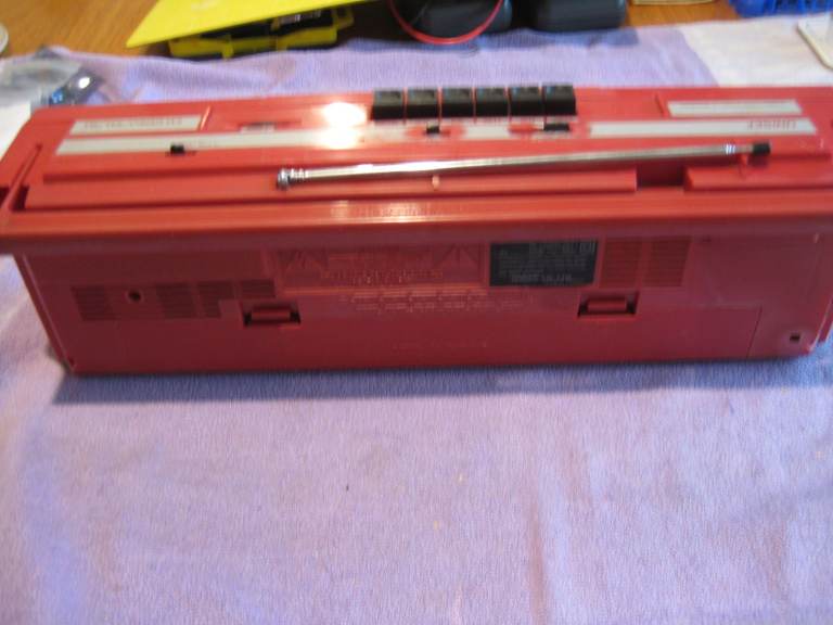 It is far from perfect, the plastic is faded in places, some of the labels have worn off, the carry handle and cassette door have broken and been glued back together, the aerial mounting is broken and so it flops around and doesn’t make contact with the circuit board inside. The radio works (will work better is aerial is fixed) but the cassette player needs attention, it will play a tape but sounds poor and the FF and RW functions are slow and jerky, it almost certainly needs new drive belts. It can be run from batteries or mains (cable included) but I have not tested to see if if function properly with batteries.