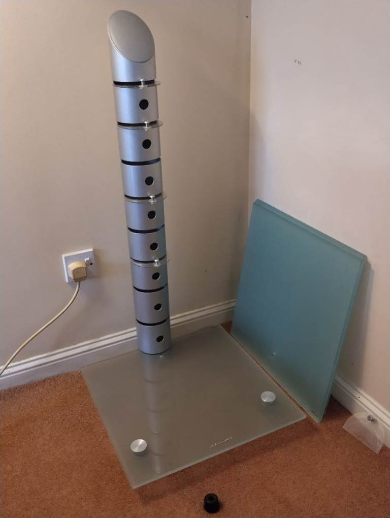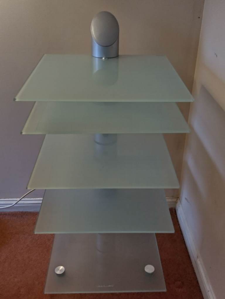 Hifi rack comprising a metal spine and five frosted glass shelves. The metal spine has nine slots for the shelves so you can arrange them to suit the different sizes of your hi-fi components. It's about twenty years old and so is pretty strong.
