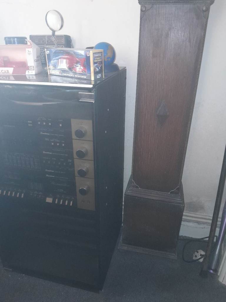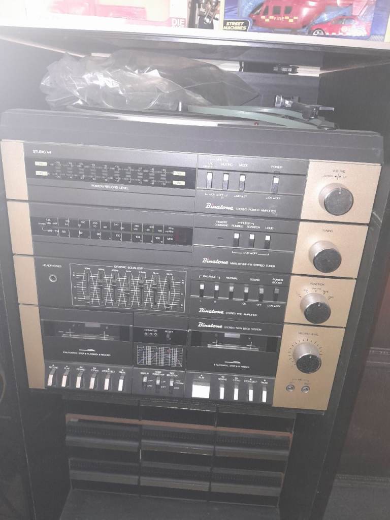 1970s binatone twin deck remote control tower system. Record player (I brought a belt needs fitting) twin cassette deck radio vhf mw lw graphic equaliser amp filters glass door and lid this 70s icon case good condition cassette draws in the bottom which pull out for Record storage new needle a real piece of history I'm 60 and I had 1 of these in the 70s but needs to go their is no speaker's with this they perished in storage I have tride other speaker's and it sounds perfect full stereo £100 ono