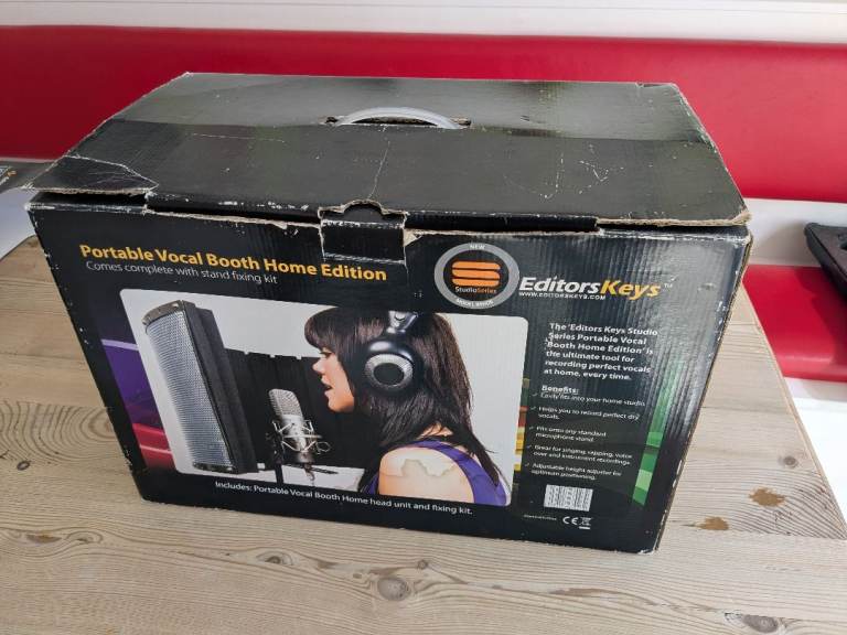 Editors Keys Portable Vocal Booth with stand brackets, Pop Shield and Boom Microphone Stand. Good used condition.