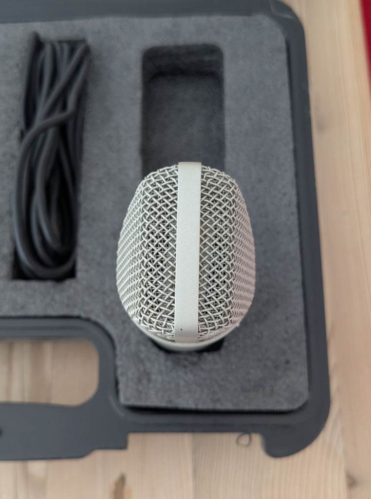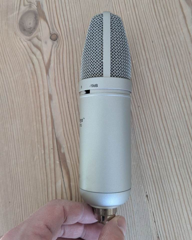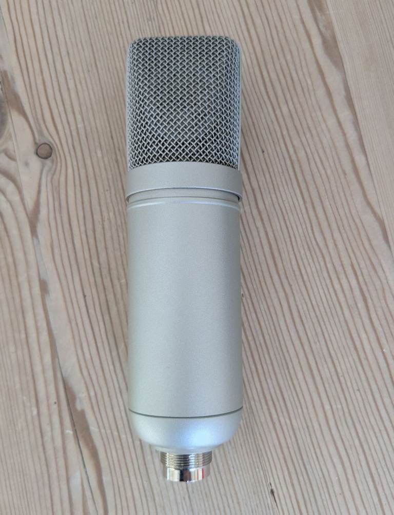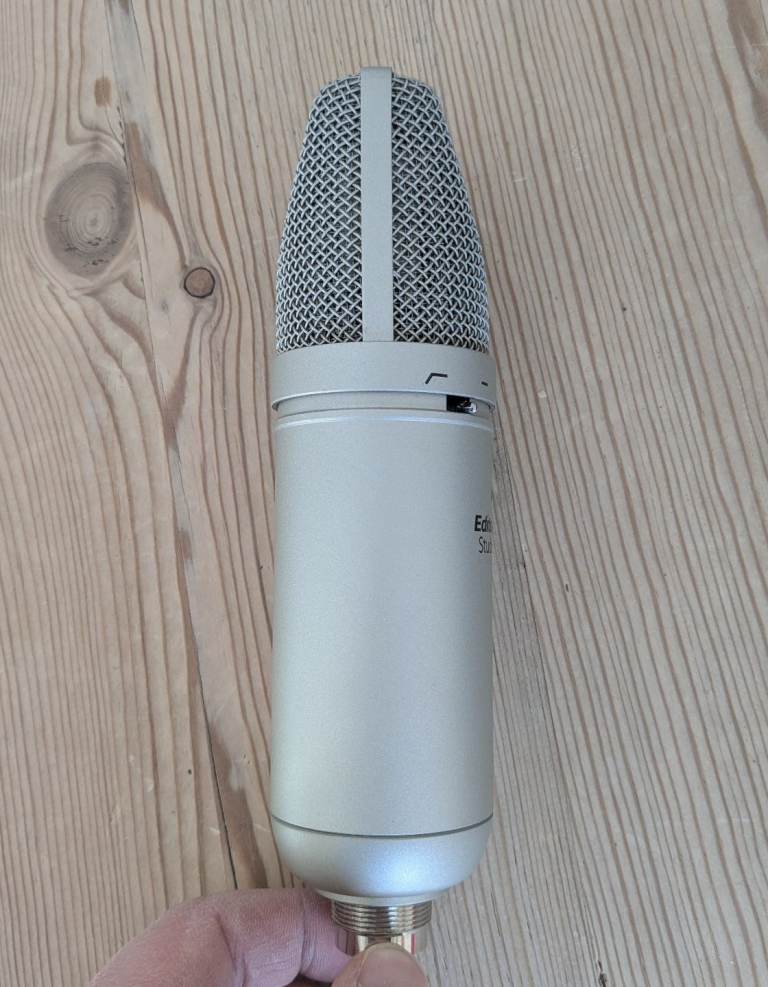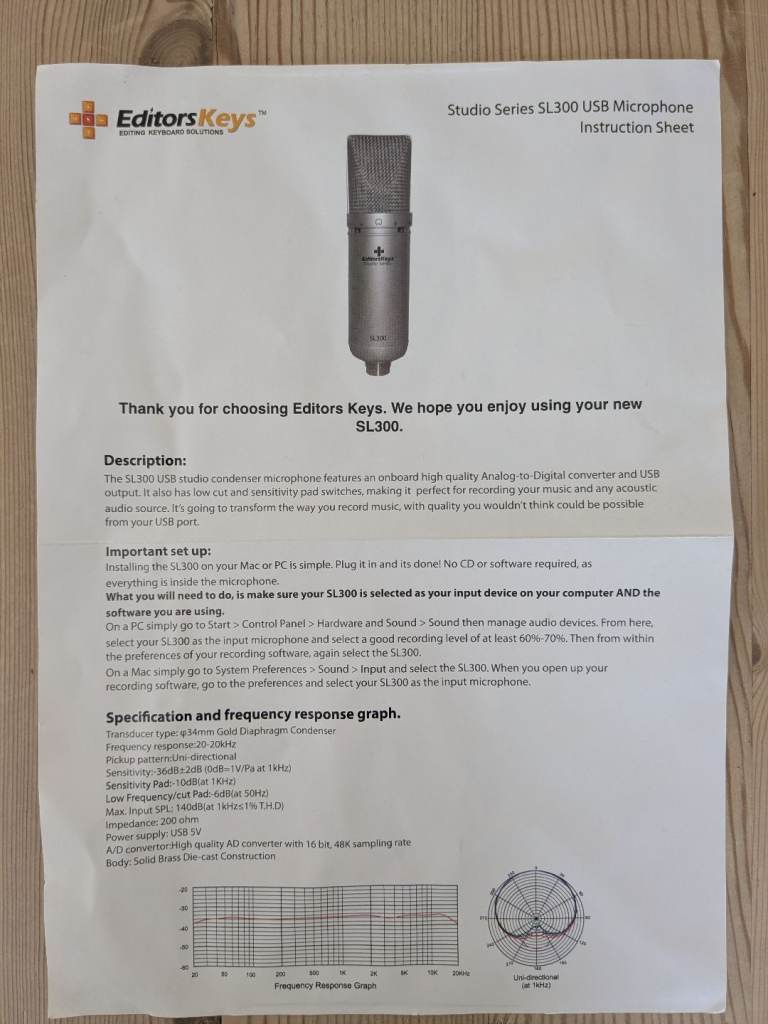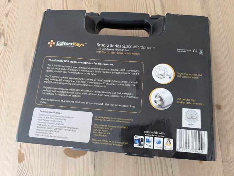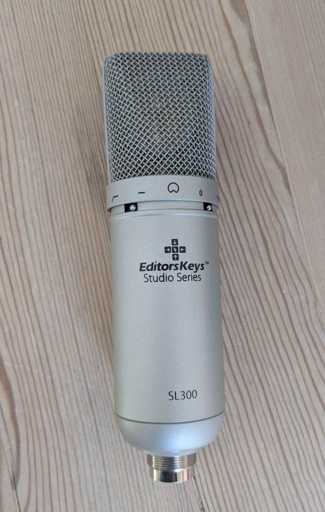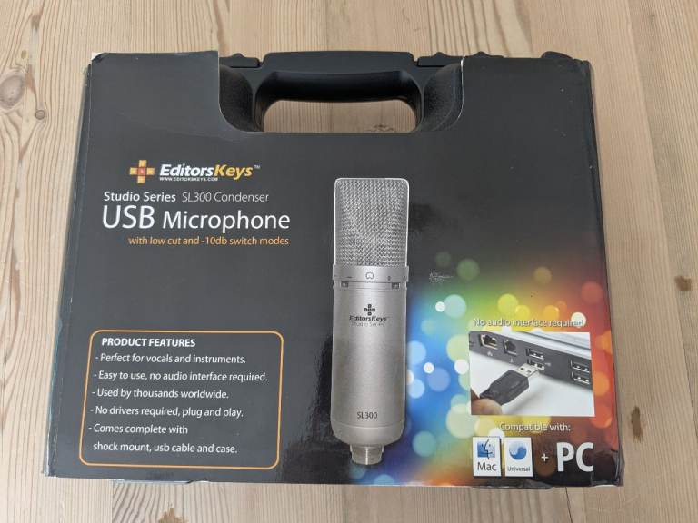 Editors Keys SL300 condenser studio microphone with shock mount, cable and carry box. Very good used condition.