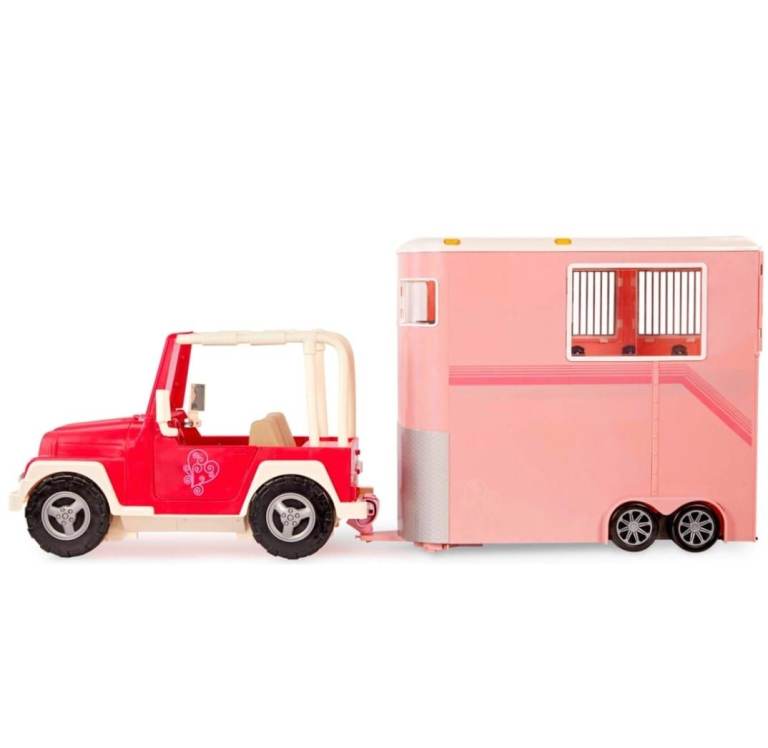 The Our Generation Mane to Travel Horse Trailer is the perfect equestrian accessory for 46cm dolls and their favourite horse pals. It even has a trailer hitch that connects the trailer to the Our Generation Off Roader vehicle.