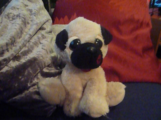 Lovely gift! For ages 2 to 102!! So soft and cuddly and has a red lipstick kiss on his cheek. Just give him a gentle squeeze on his neck and he will give you an adorable kiss! He has huge brown eyes and you cannot help but fall in love with him. Height 24cm (sitting down) From clean smoke free home.