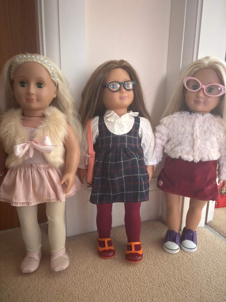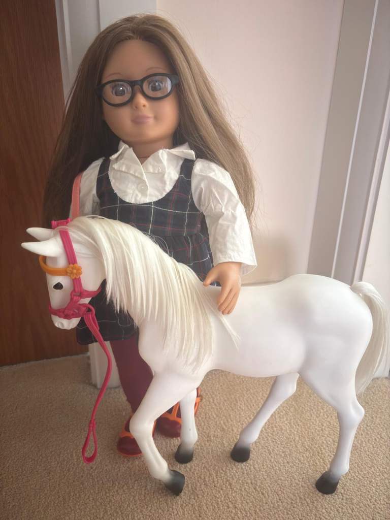 Three Generation Dolls with back pack and various clothes and accessories, including horse, puppy and sleeping bag.