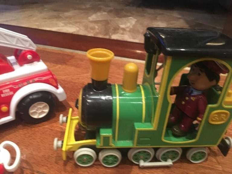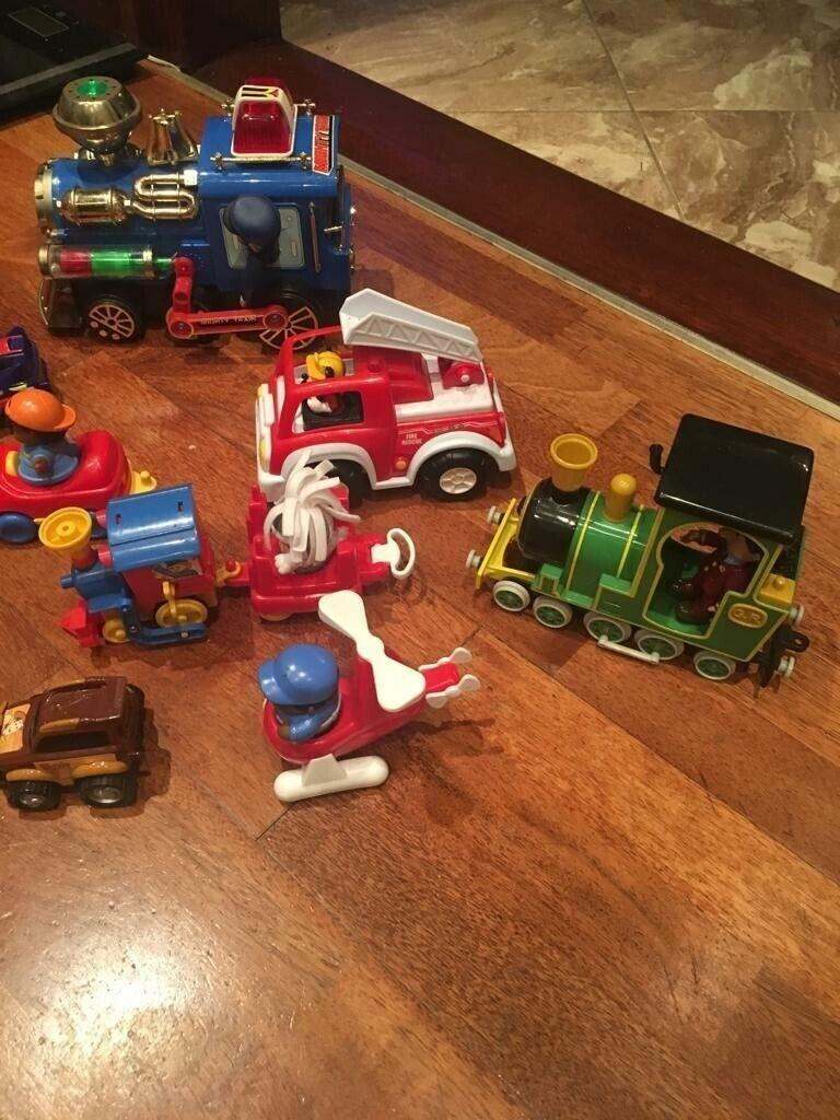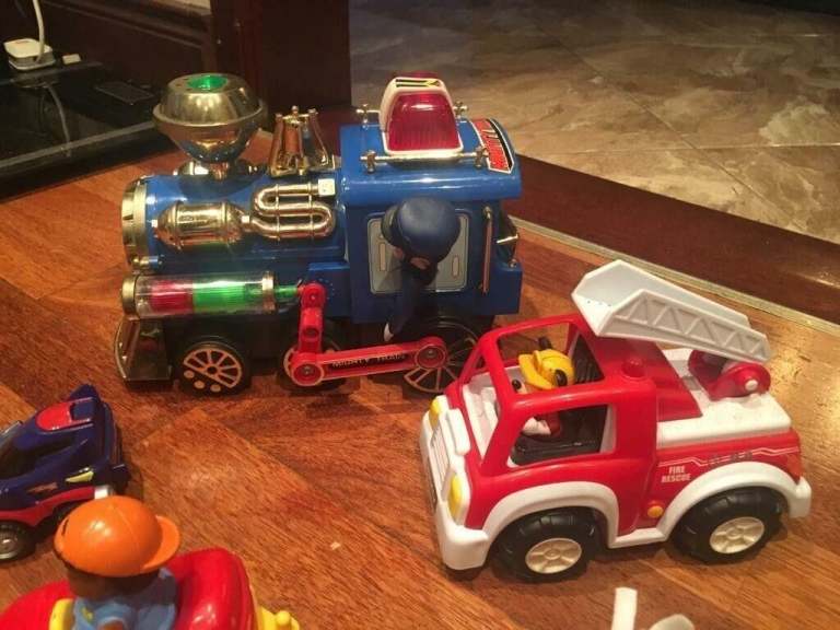 5 child’s toys, blue train, vintage and battery operated
