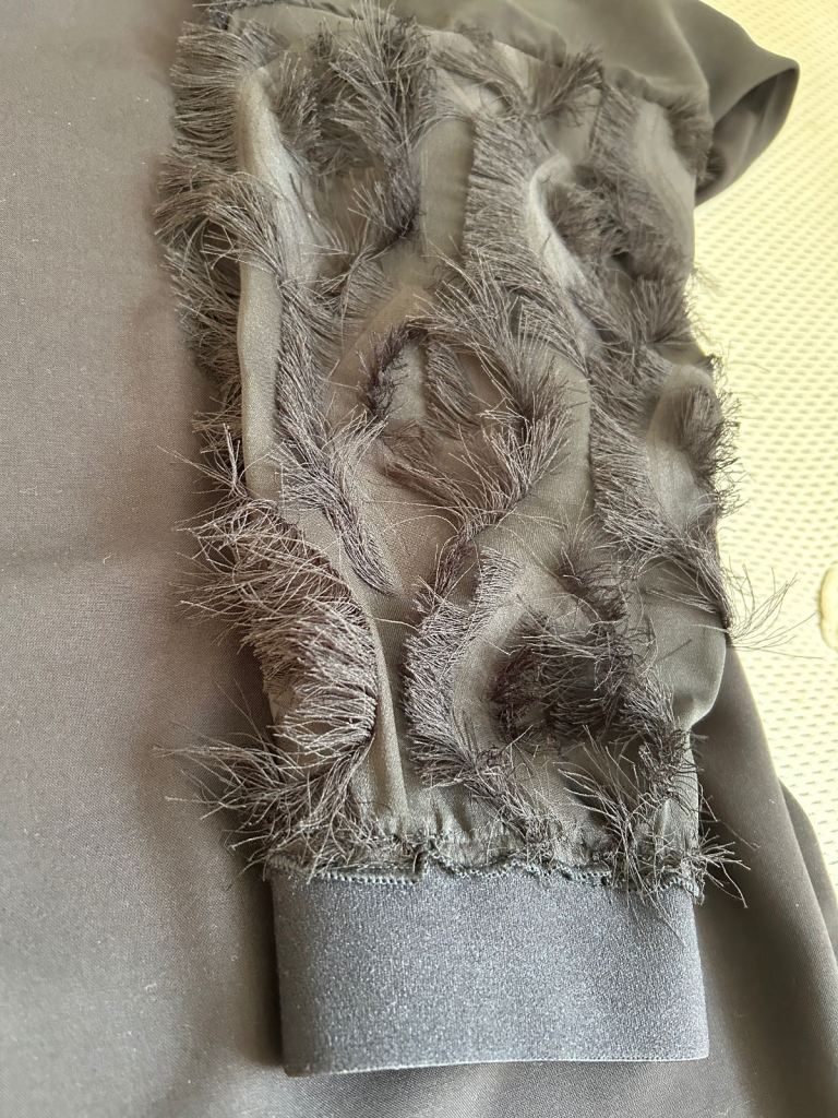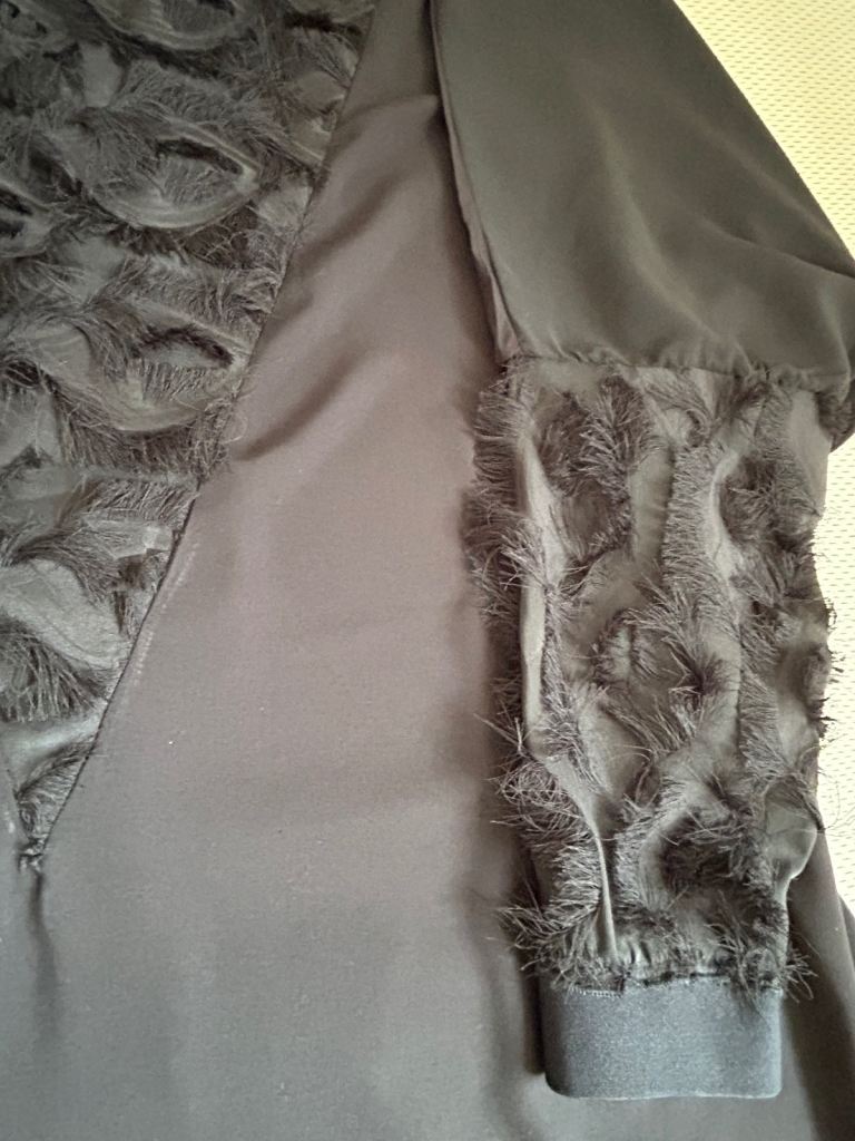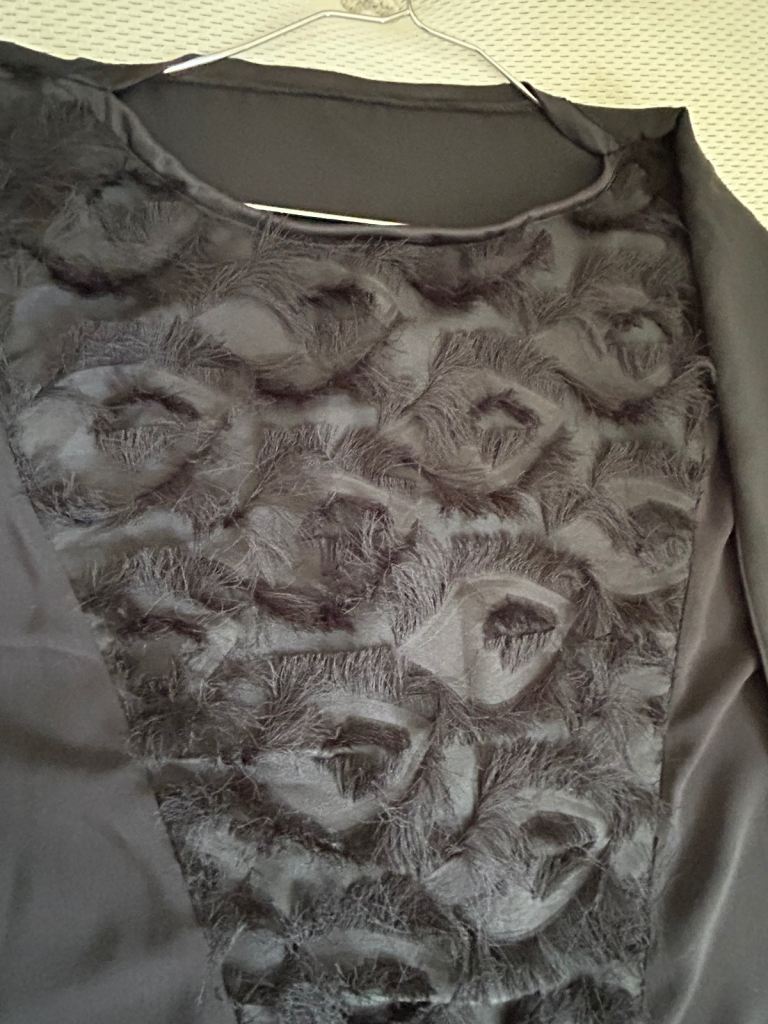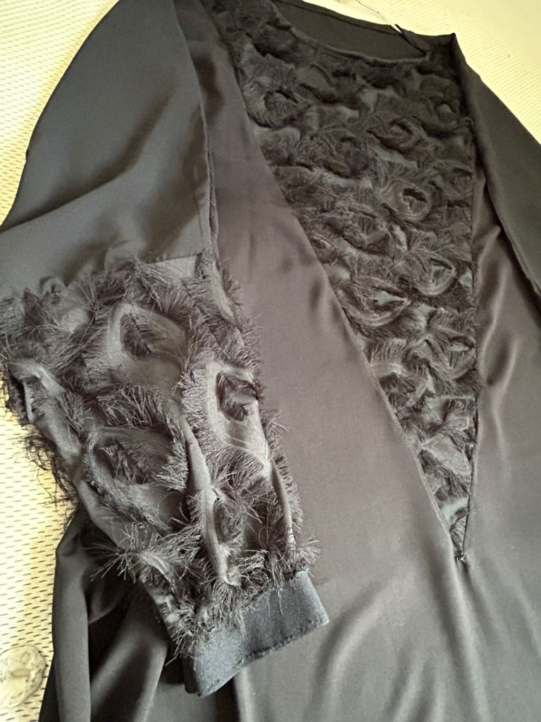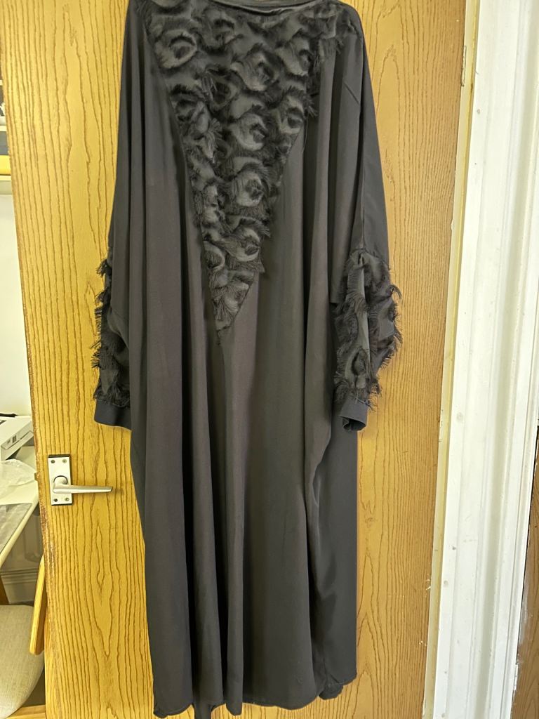 Black Abaya . Lovely flowery fabric.. Batwing Style. Feature on the front bodies and the sleeves. - in a feathery like Fabric, very pretty . 58 inches length.